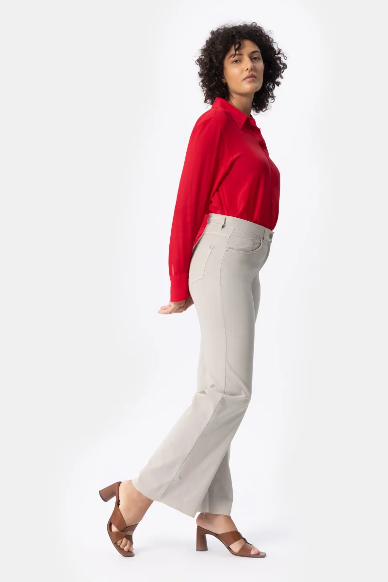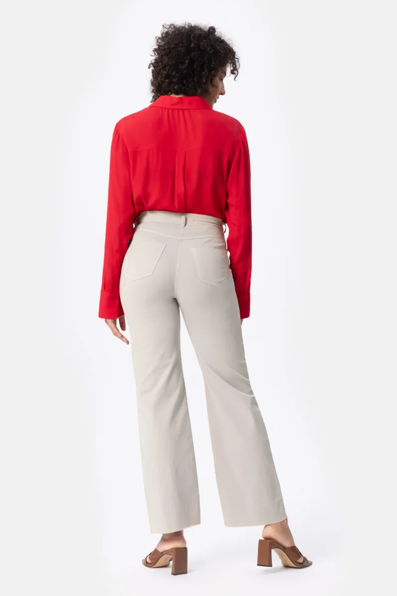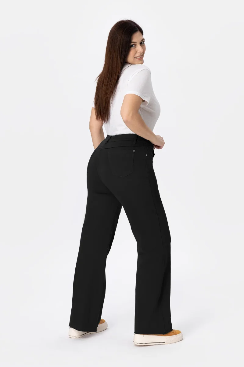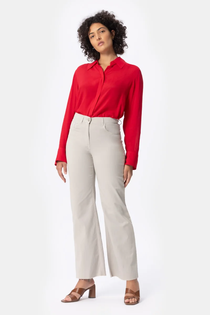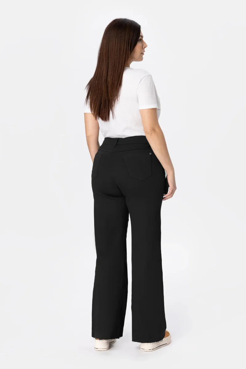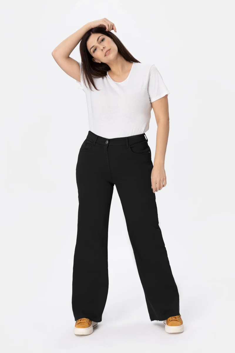 Pantalone 5 tasche in cotone super stretch con vestibilitร palazzo e gamba ampia. Questo modello รจ costruito con vita regolare elasticizzata, chiusura con zip e bottone. Un pantalone attuale, comodo e per ogni occasione, da quelle piรน quotidiane a quelle piรน eleganti. Abbinalo al sandalo giusto e sarร un capo essenziale per questa stagione. Disponibile in diversi colori: da quelli piรน classici a quelli piรน vivaci e alla moda.