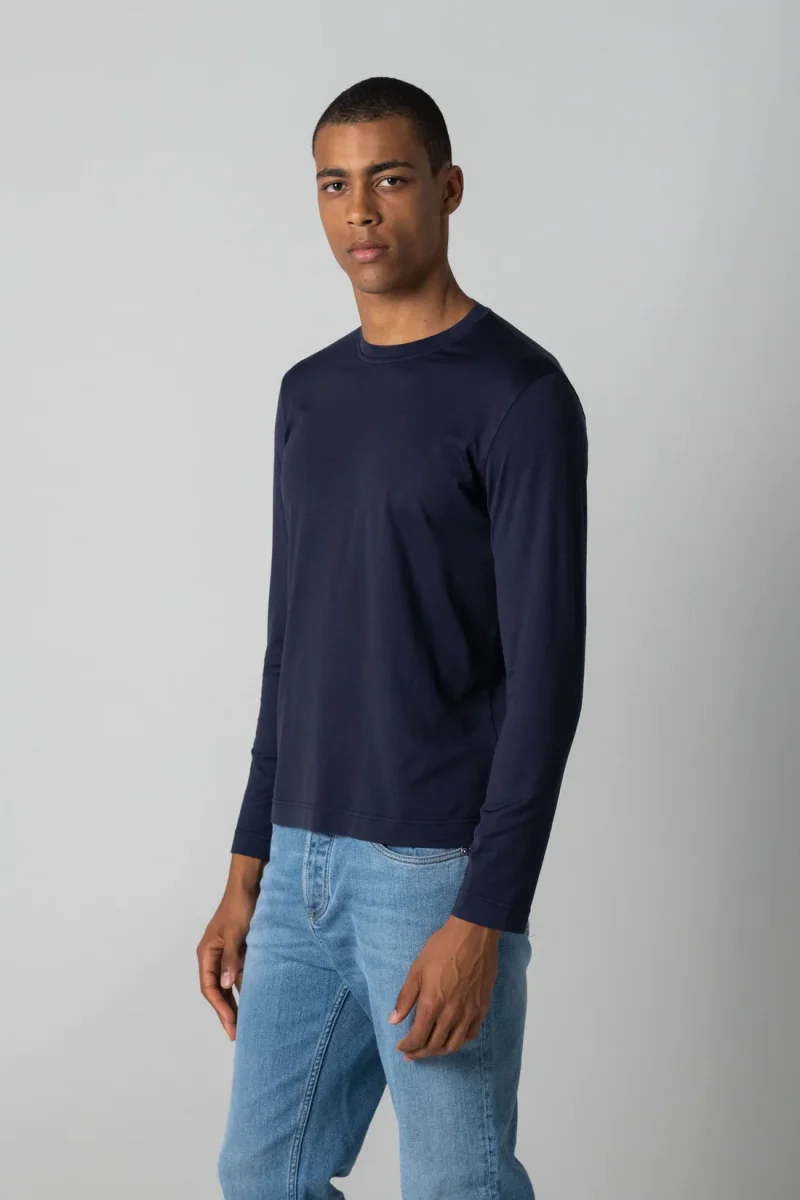 T-shirt in jersey che rappresenta un’opzione versatile e comoda per il tuo guardaroba.ย Progettato con maniche lunghe, รจ adatto a varie occasioni e stagioni.ย Realizzata in pregiato jersey di cotone organico Giza al 100%, la t-shirt offre un tocco morbido e un’eccellente traspirabilitร .
