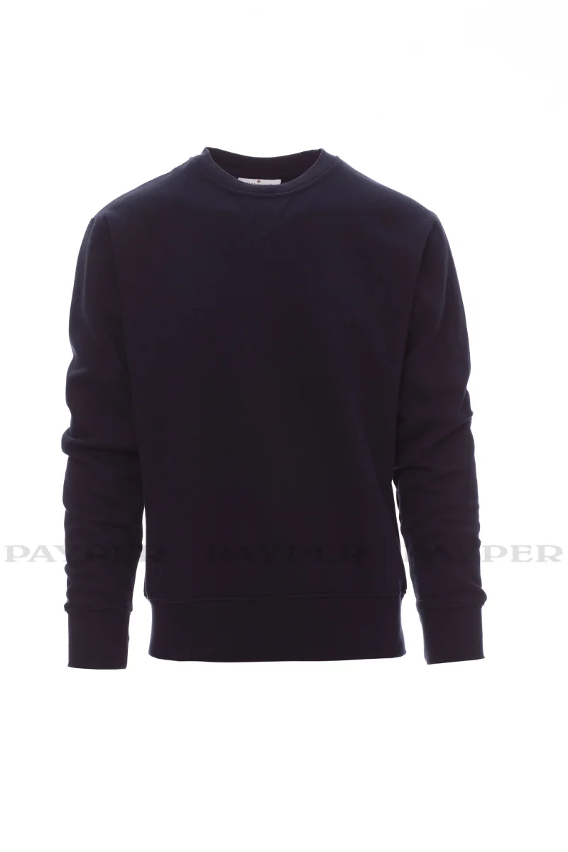 Felpa da uomo, girocollo, cucitura estetica a V al collo, manica a giro, polsini e vita in costina elasticizzata, cuciture rinforzate.
