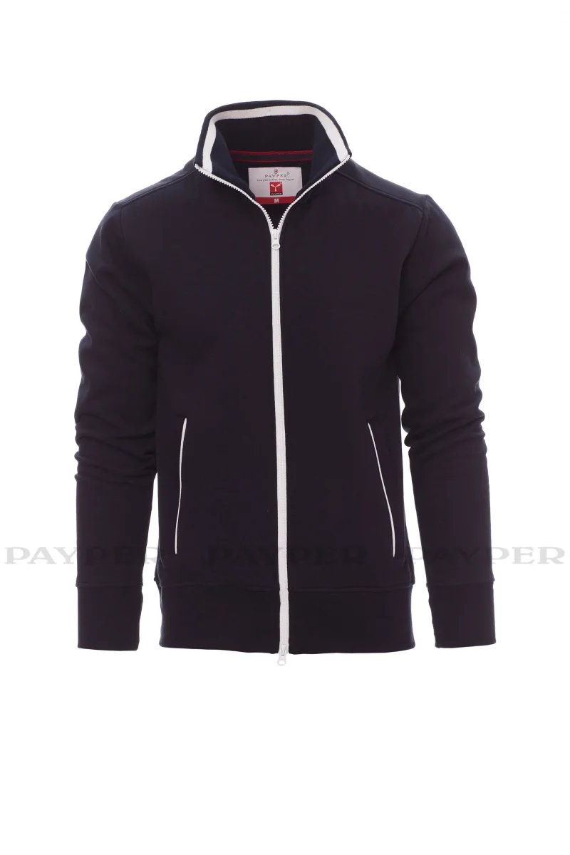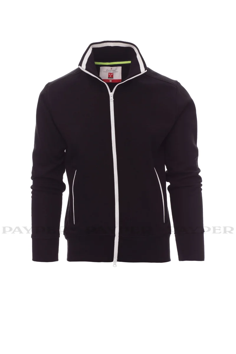 Felpa da uomo, zip intera SBS in plastica in colore a contrasto, con doppio cursore in metallo. Colletto in rib con profilo a contrasto anche alle tasche laterali, manica a giro, due tasche esterne con zip a contrasto, polsini e vita in costina elasticizzata. Cuciture rinforzate.