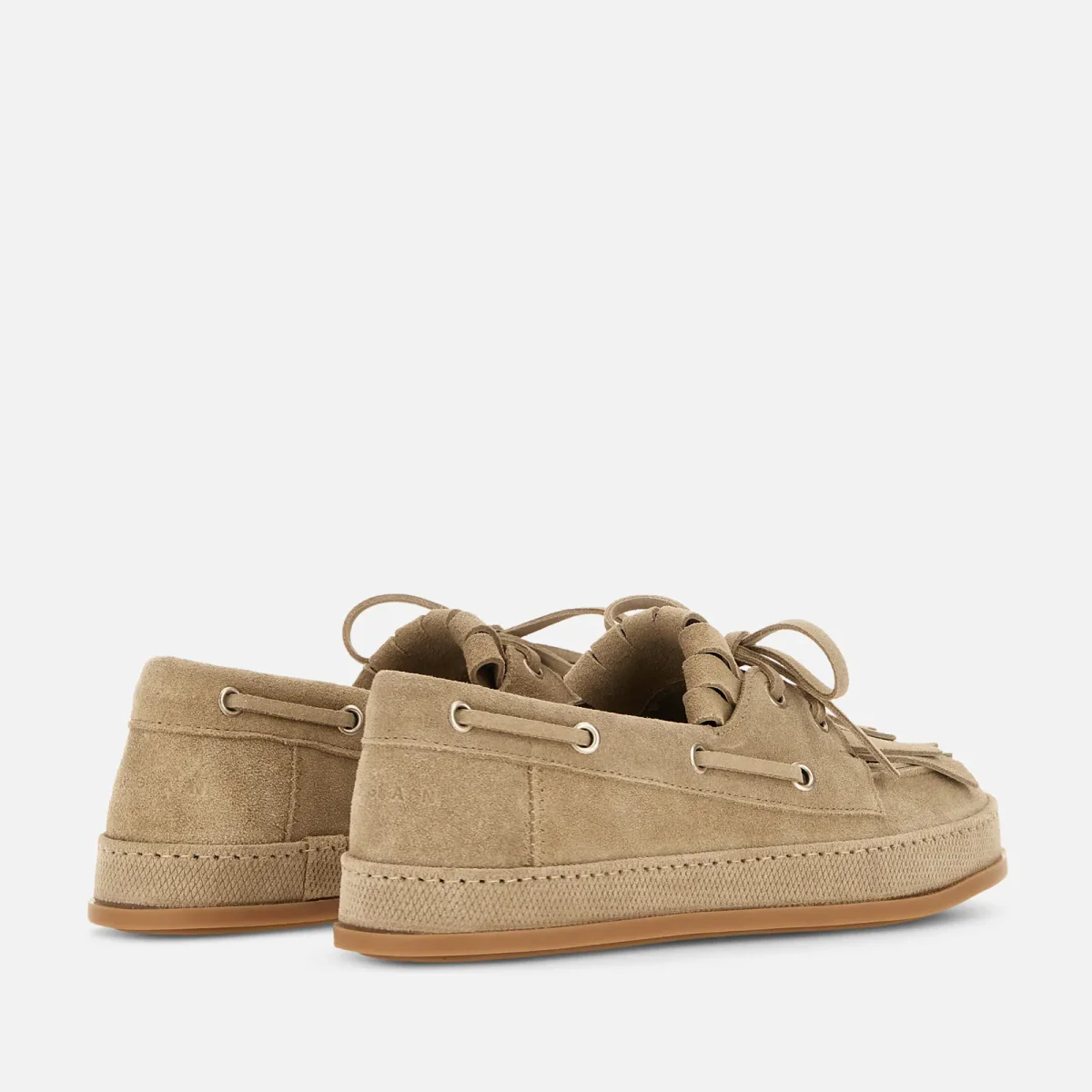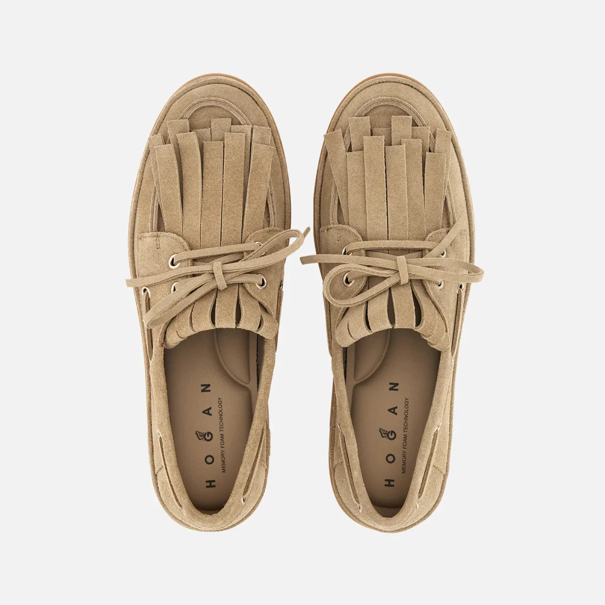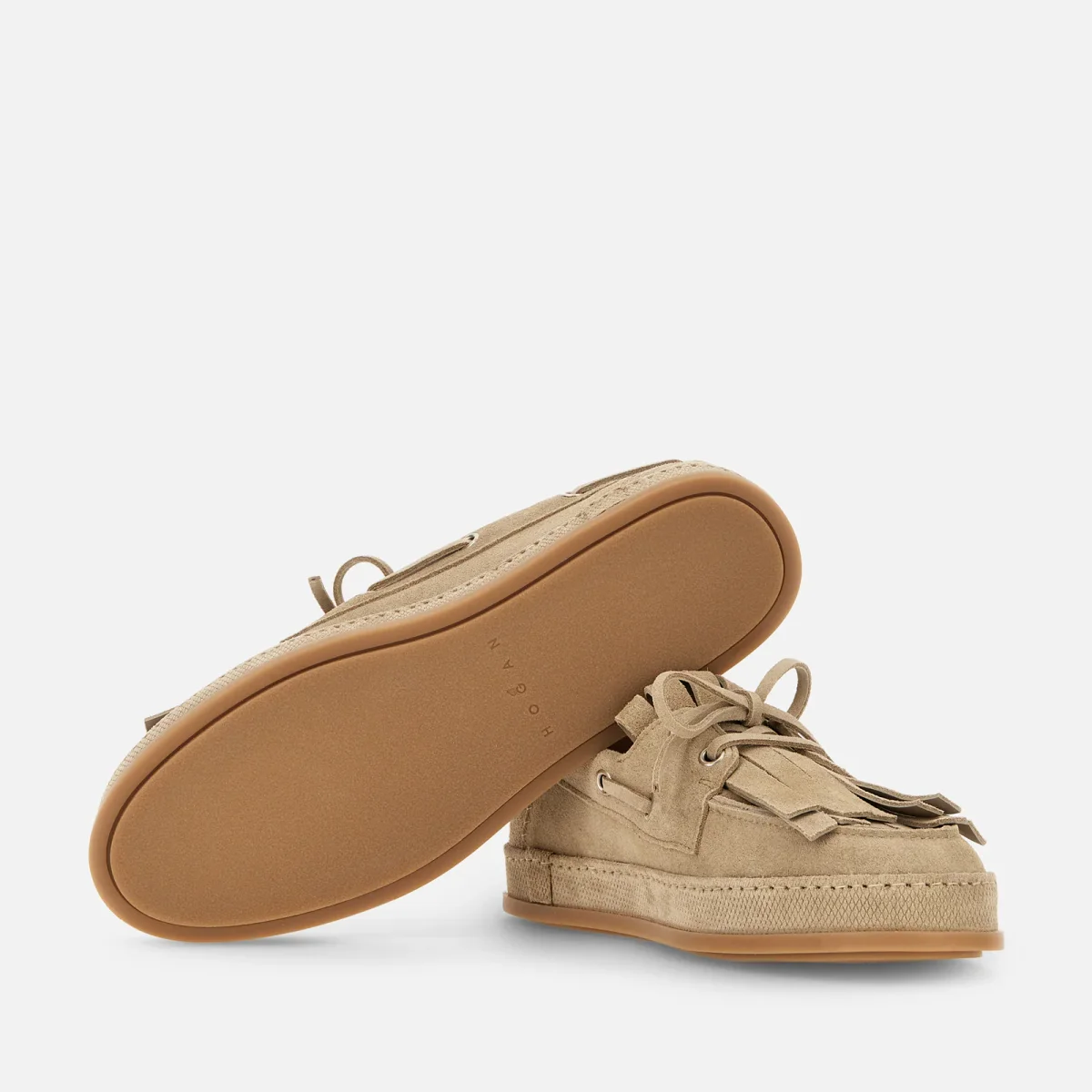 Con una suola unica rivestita e un look sobrio e sofisticato al tempo stesso, le boat shoes Hogan H683 in pelle scamosciata sono caratterizzate da un bordo inferiore intonato alla tomaia. Dotate di una costruzione artigianale e un fondo in gomma leggera, presentano il tipico laccetto passante, frange asimmetriche e il logo Hogan sul tallone. Completate da una soletta in memory foam, sono un must-have urbano per i cultori del dettaglio.