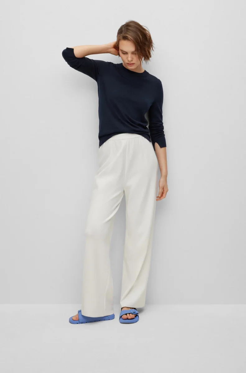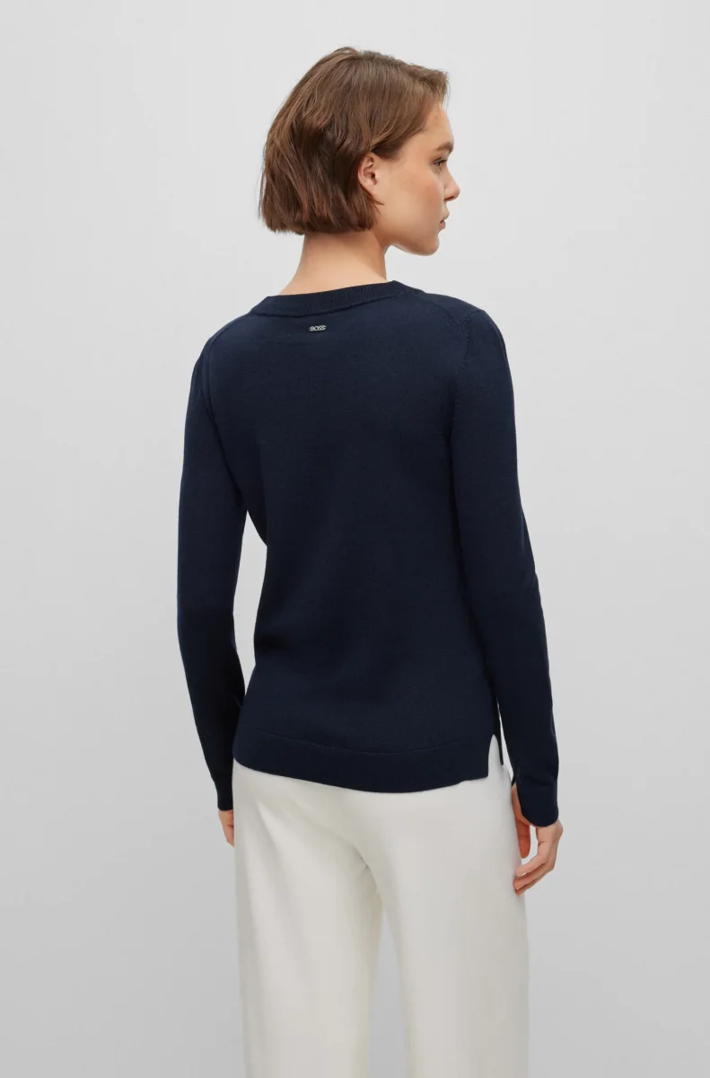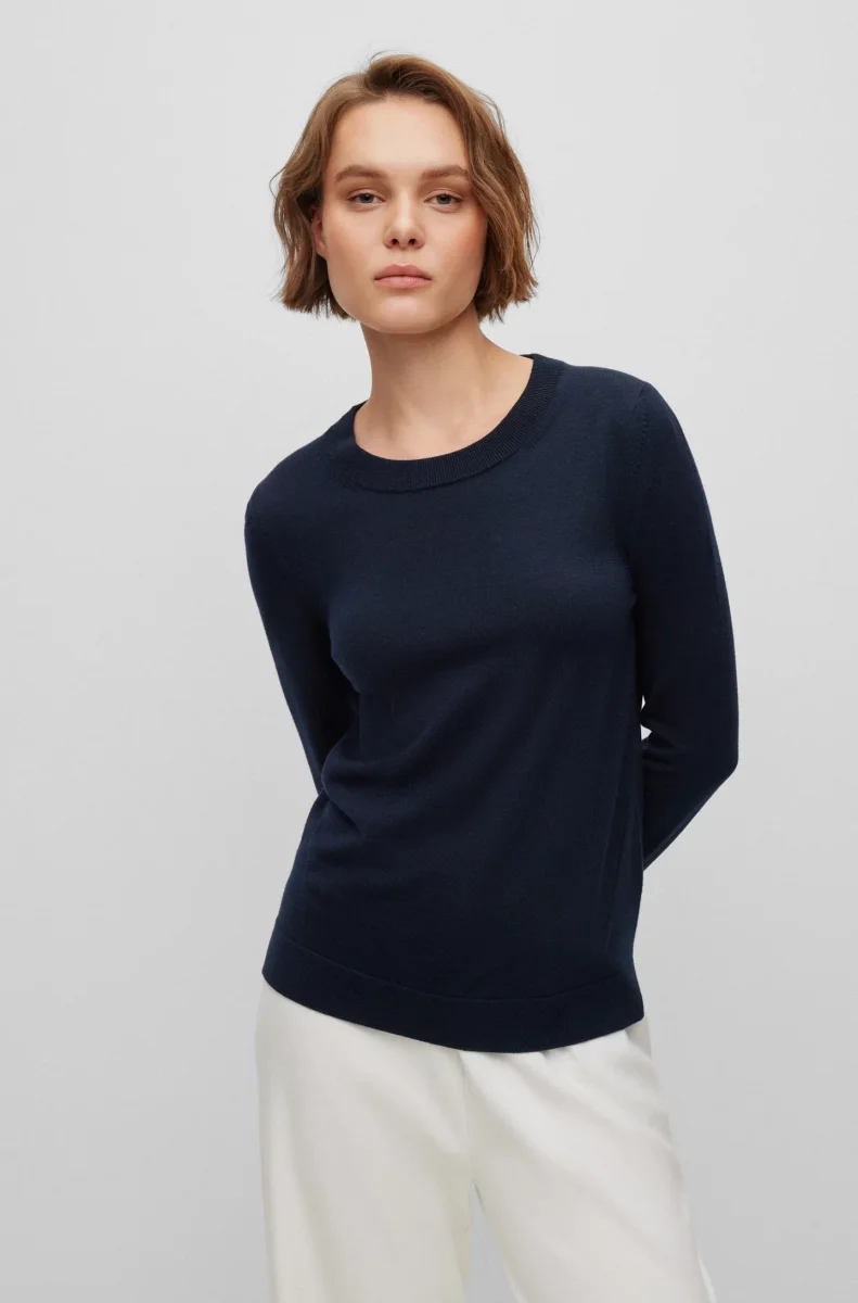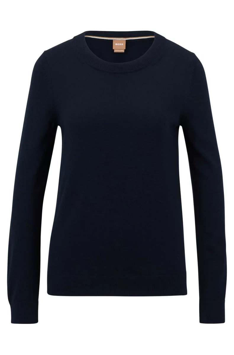 Un versatile maglione regular fit con scollatura a girocollo. Fa parte della collezione dei prodotti RESPONSIBLE Hugo Boss per questi prodotti usa sempre almeno il 60% di materie prime piรน sostenibili. Questo capo รจ realizzato con lana certificata e proveniente da allevamenti responsabili.