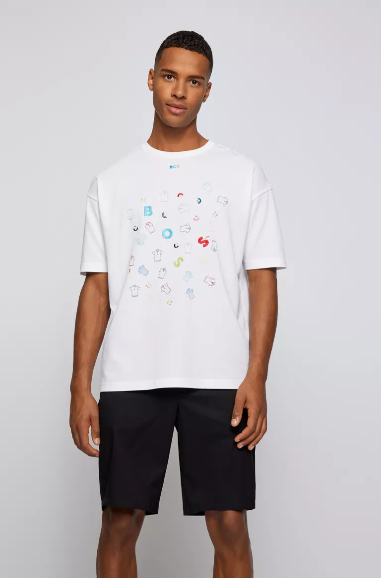 HUGO BOSS T-SHIRT RELAXED FIT IN COTONE CON GRAFICA REALIZZATA CON TECNICHE MISTE_BIANCO