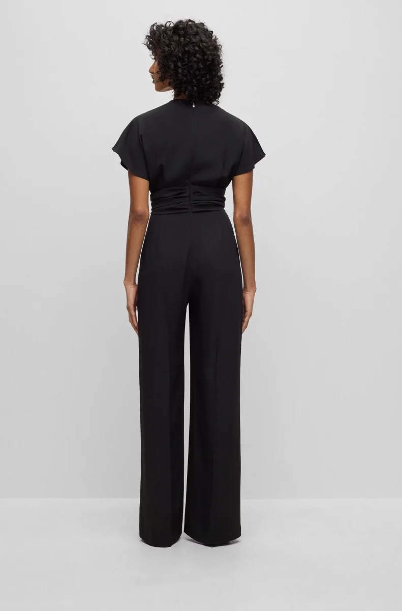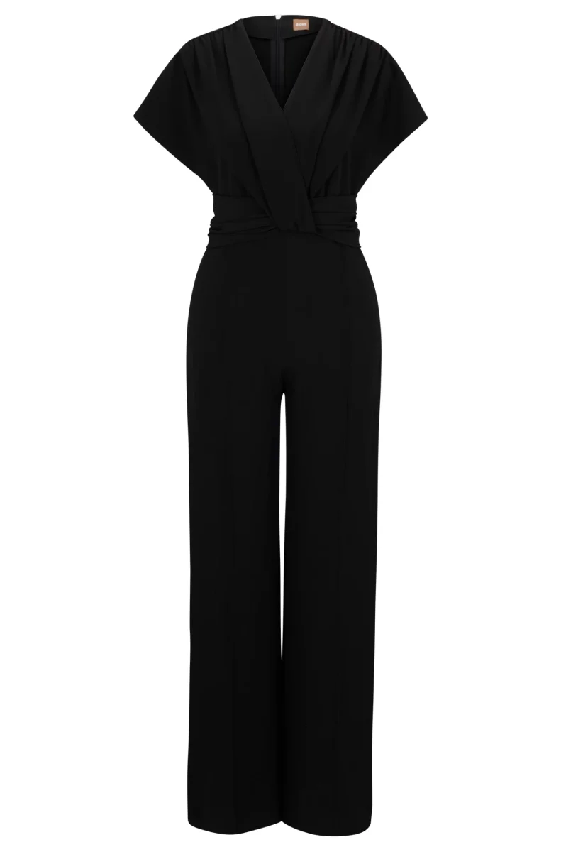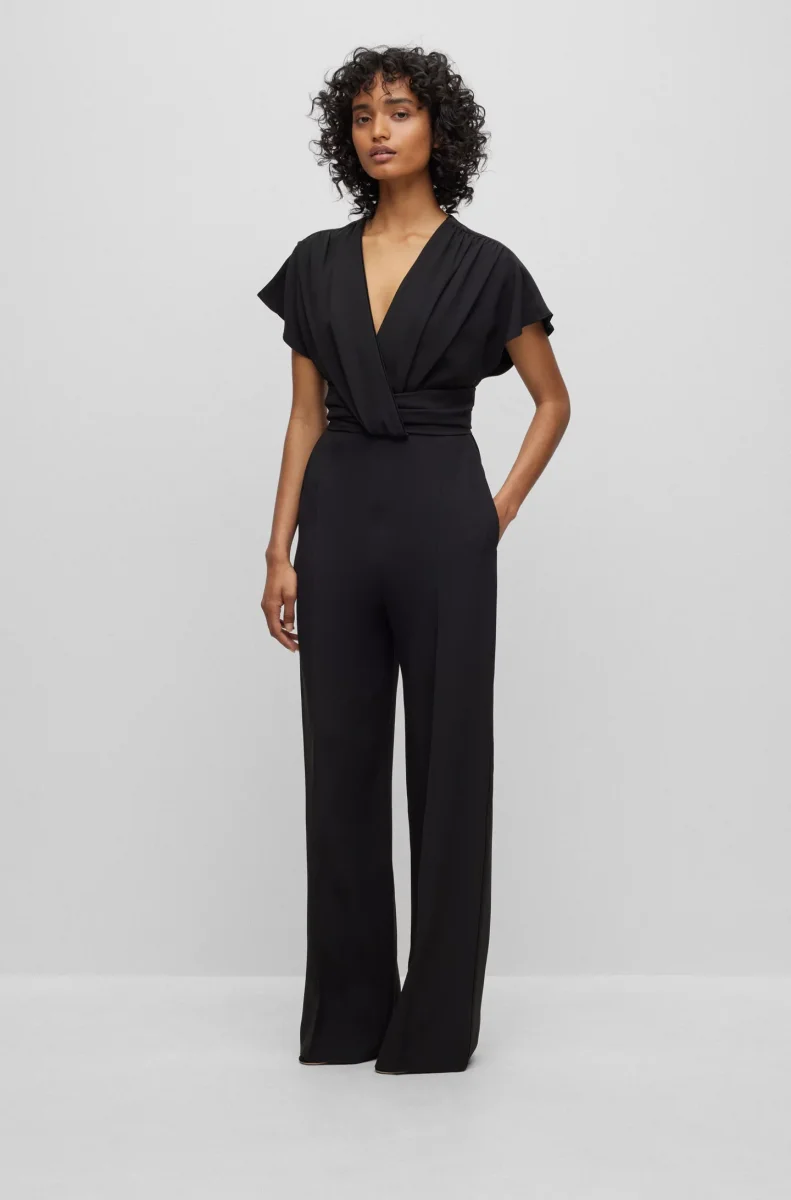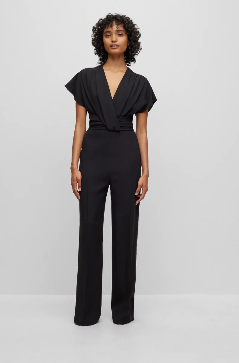 Una tuta jumpsuit slim fit realizzata in tessuto opaco con scollatura a V ed effetto avvolgente sulla parte anteriore.
