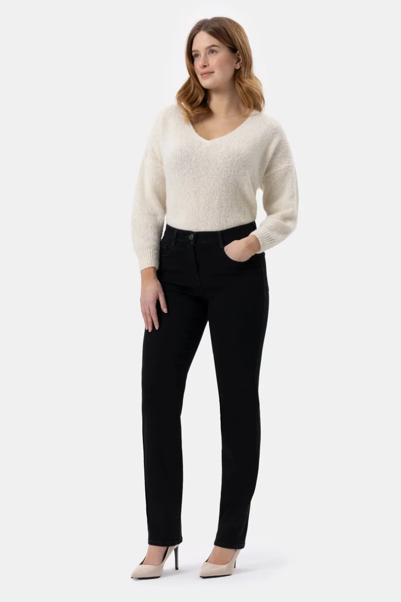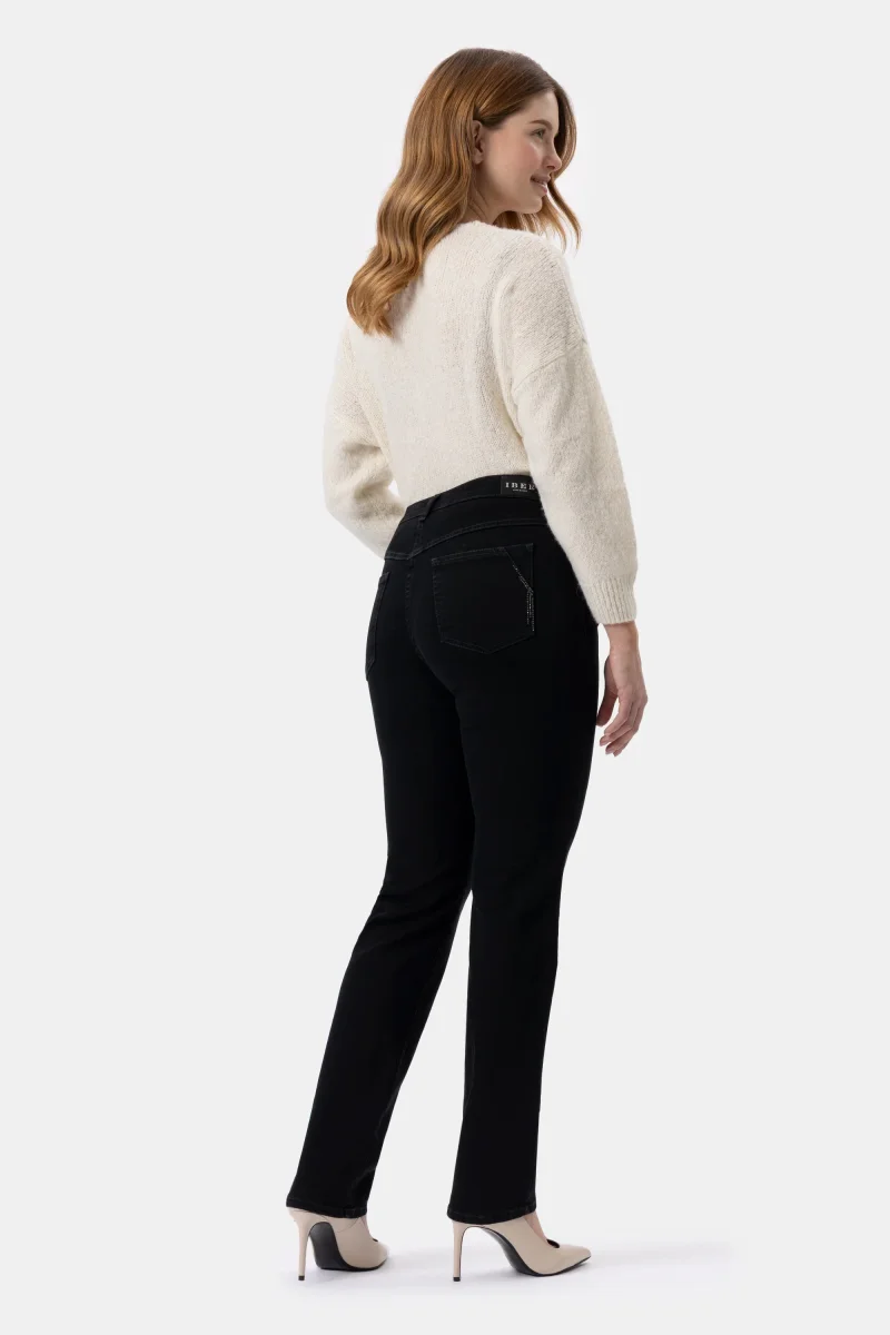 Jeans in denim super stretch con gamba dritta. Costruito con vita regolare ed elasticizzata, chiusura con zip e bottone. L’elastico in interno cintura regala un comfort assoluto. Un jeans versatile e sfizioso per essere moderna e a tuo agio in ogni occasione.