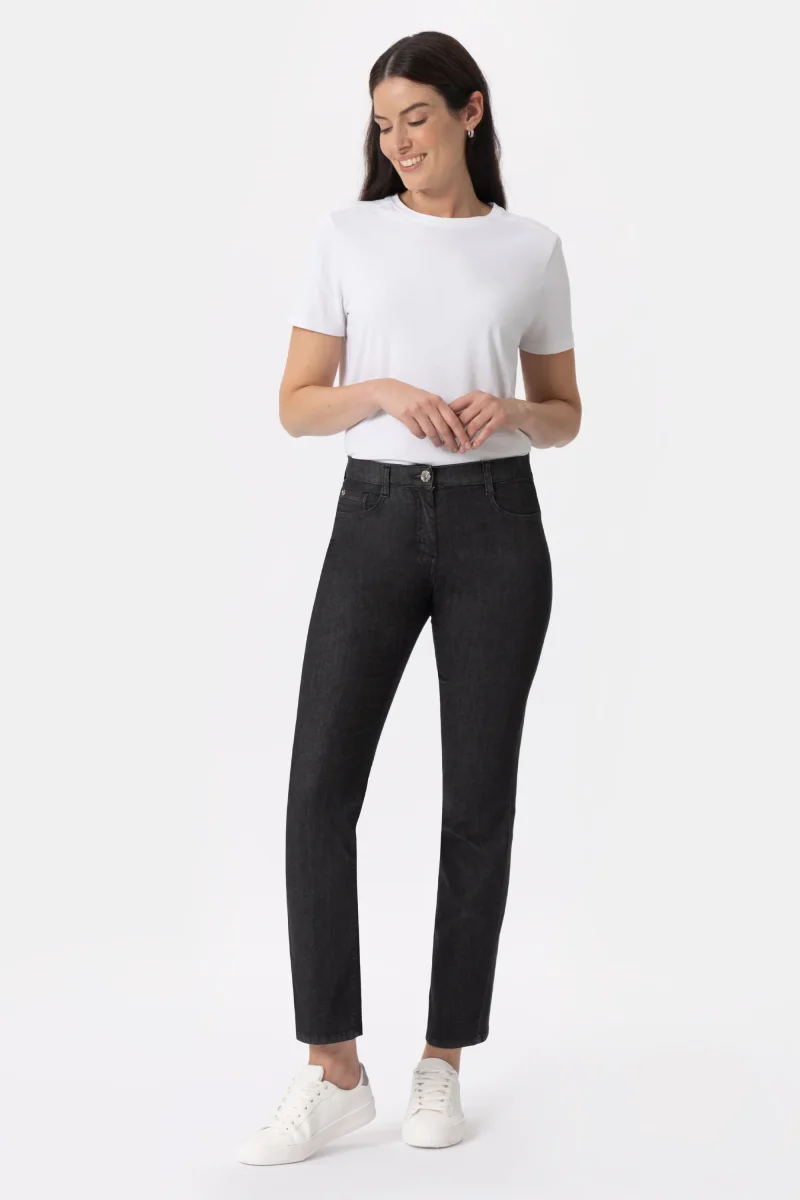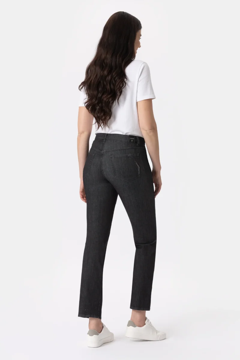 Jeans in denim black super stretch con gamba dritta. Costruito con vita regolare ed elasticizzata, chiusura con zip e bottone. L’elastico in interno cintura regala un comfort assoluto. Un jeans versatile e sfizioso per essere moderna e a tuo agio in ogni occasione.