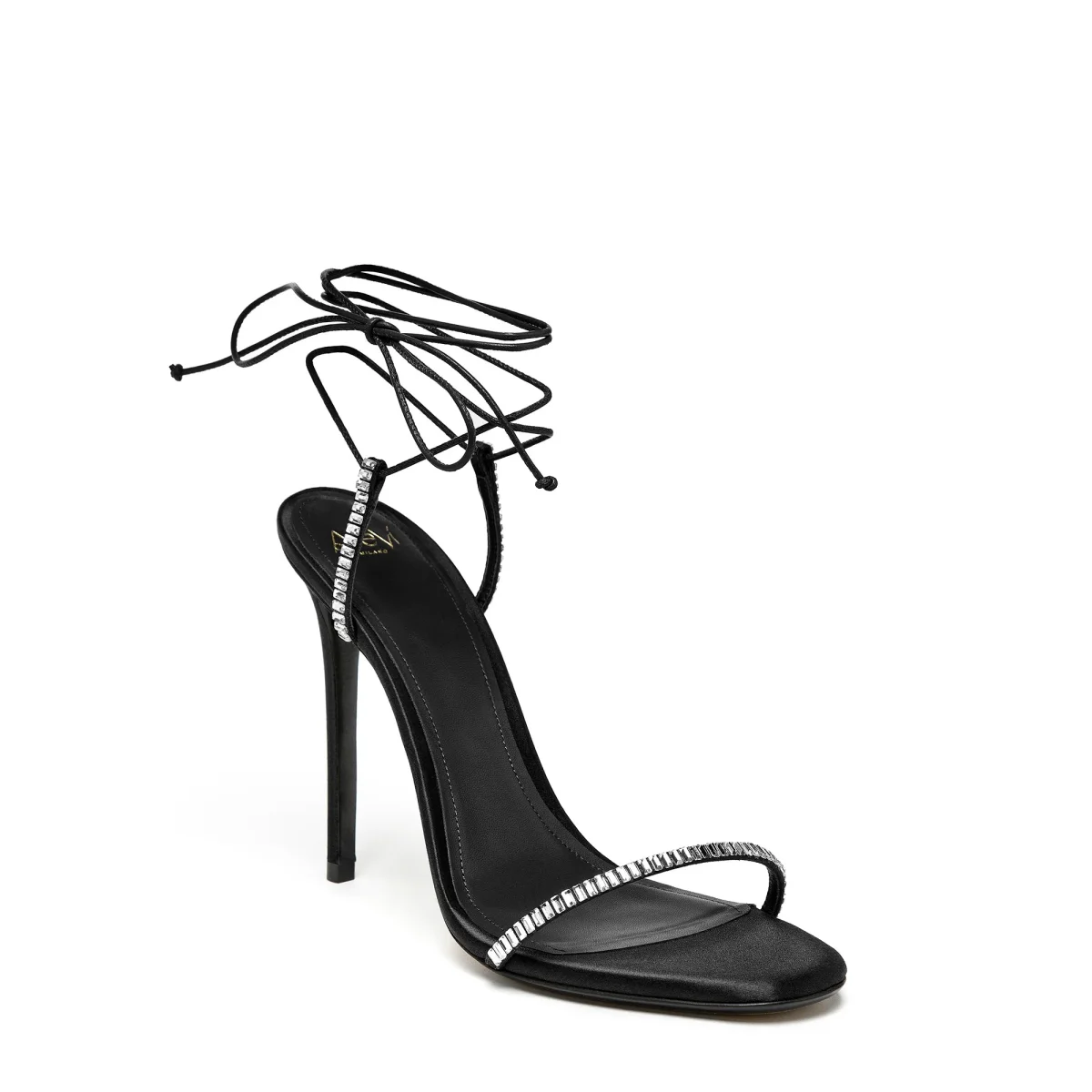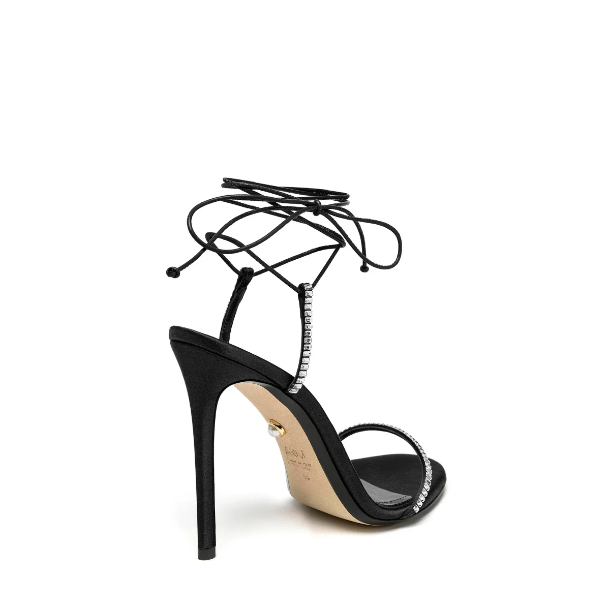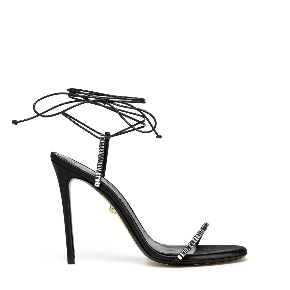 Sandalo con listini sottili in raso ricoperti di baguette crystal con allacciatura alla caviglia.Tacco a spillo ricoperto in raso.