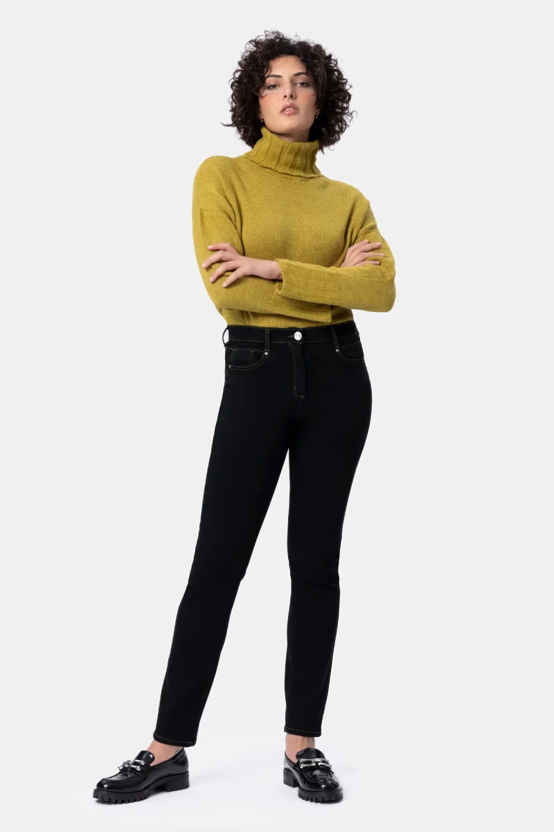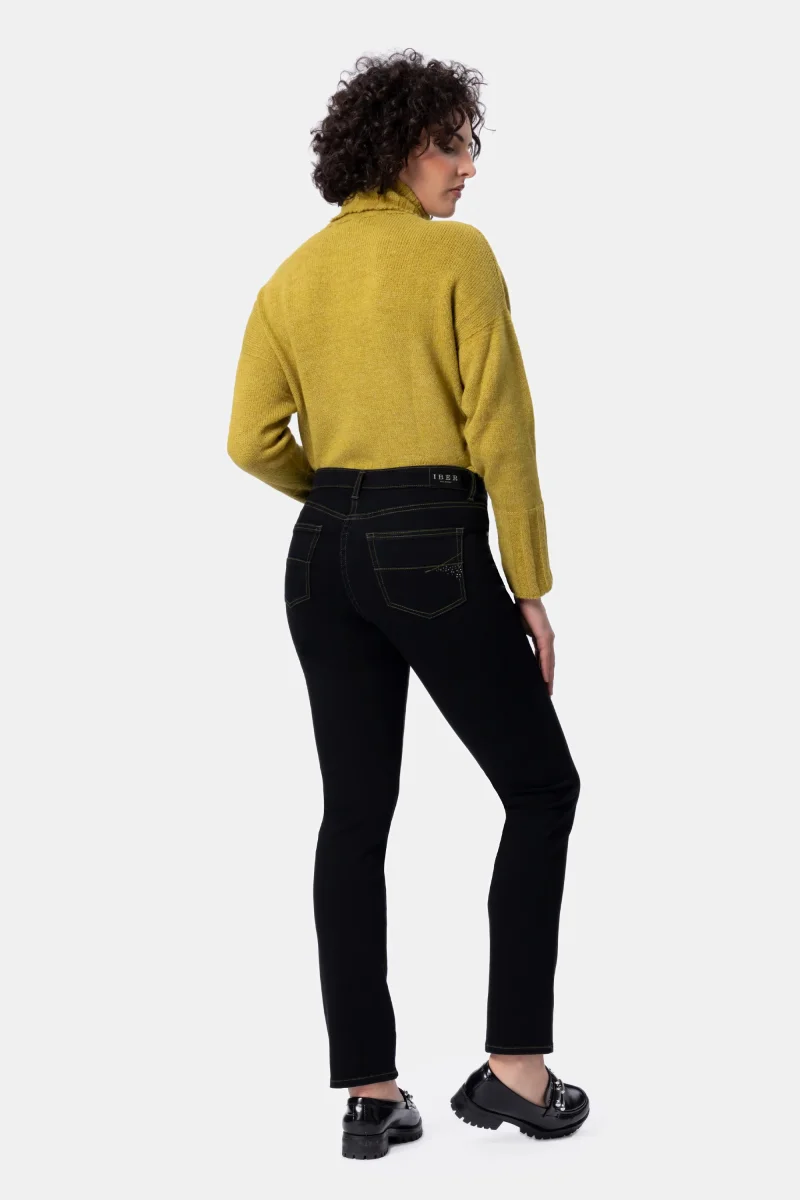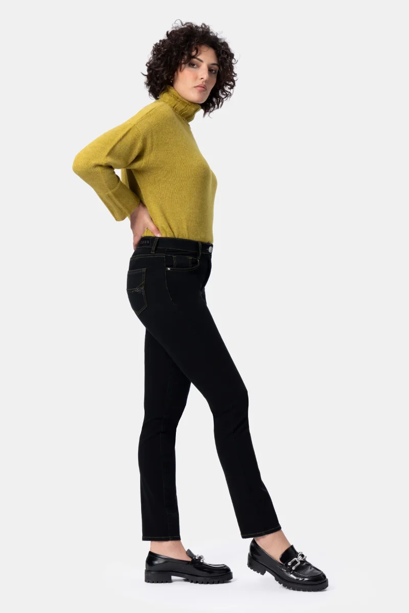 Jeans in denim nero super stretch con vestibilitร regolare. Questo modello รจ costruito con vita media elasticizzata, chiusura con zip e bottone, pratiche tasche con dettaglio strass sul retro. Un jeans versatile e un must have da avere assolutamente nel proprio armadio, ti aiuterร a creare look sempre nuovi e attuali per ogni stagione.