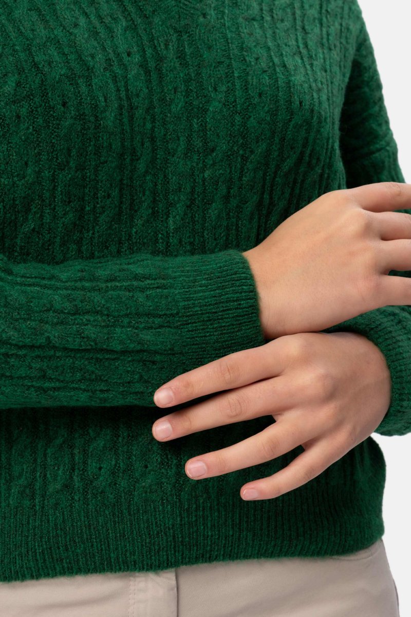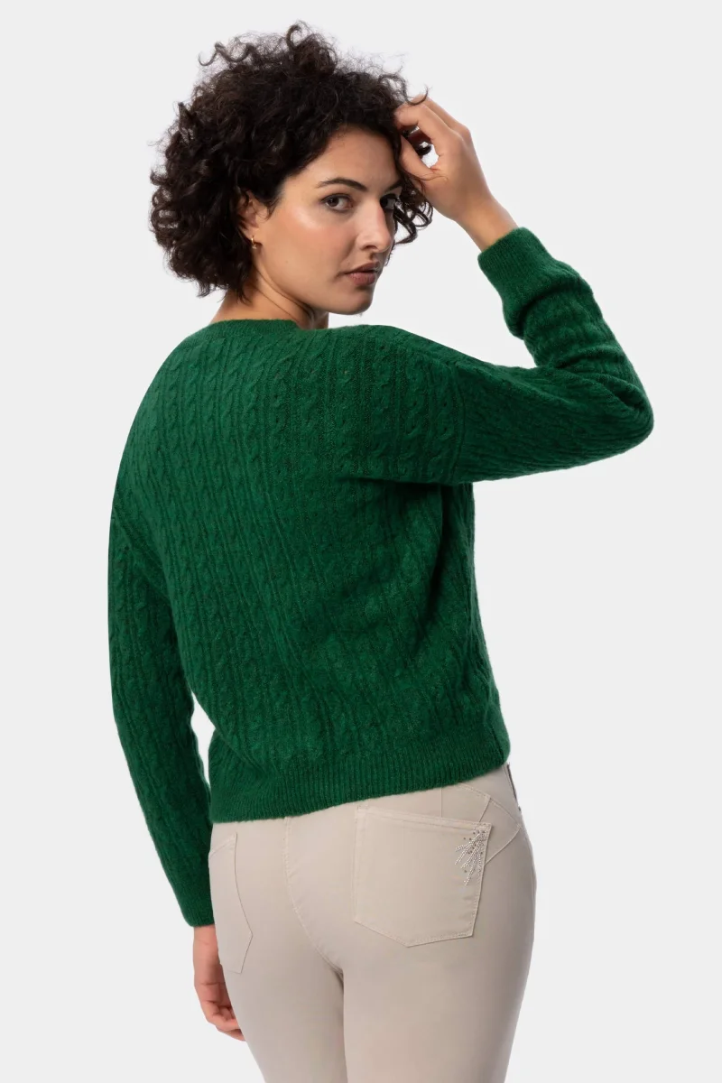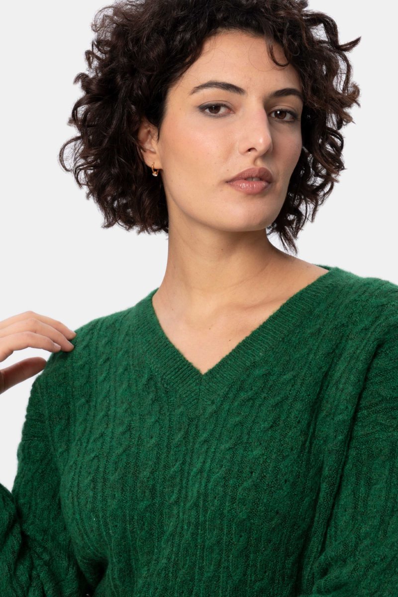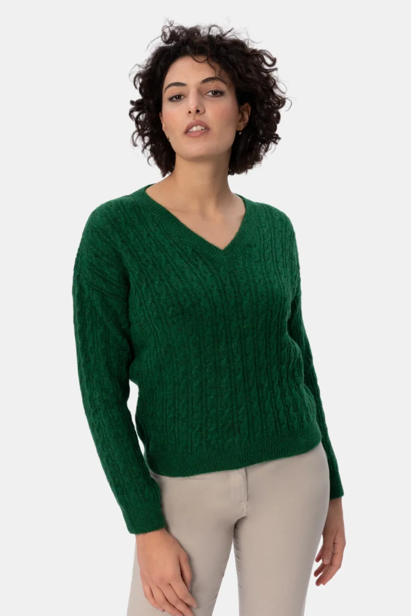 Maglia collo a V, con polso e fondo a coste. Lavorazione a trecce e vestibilitร regolare
