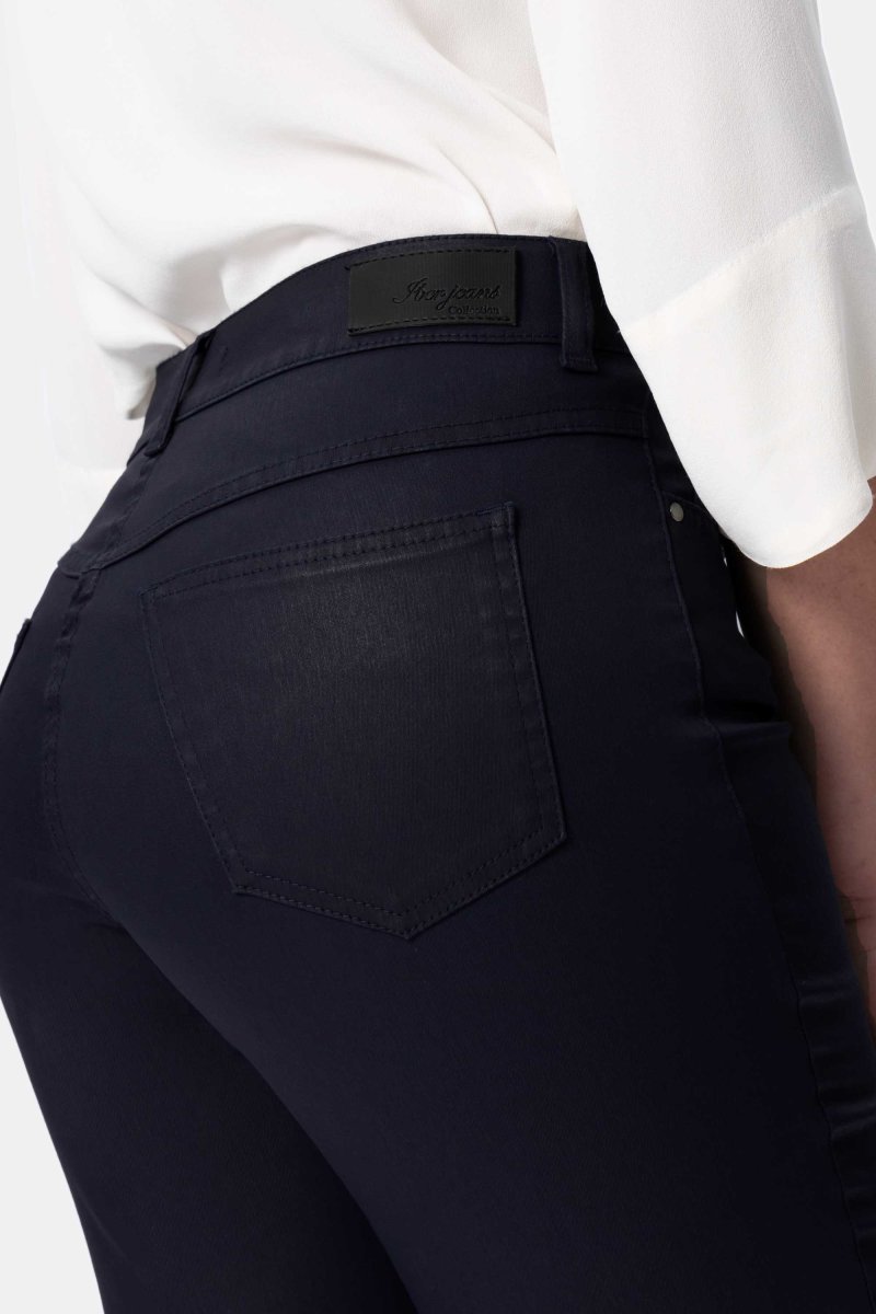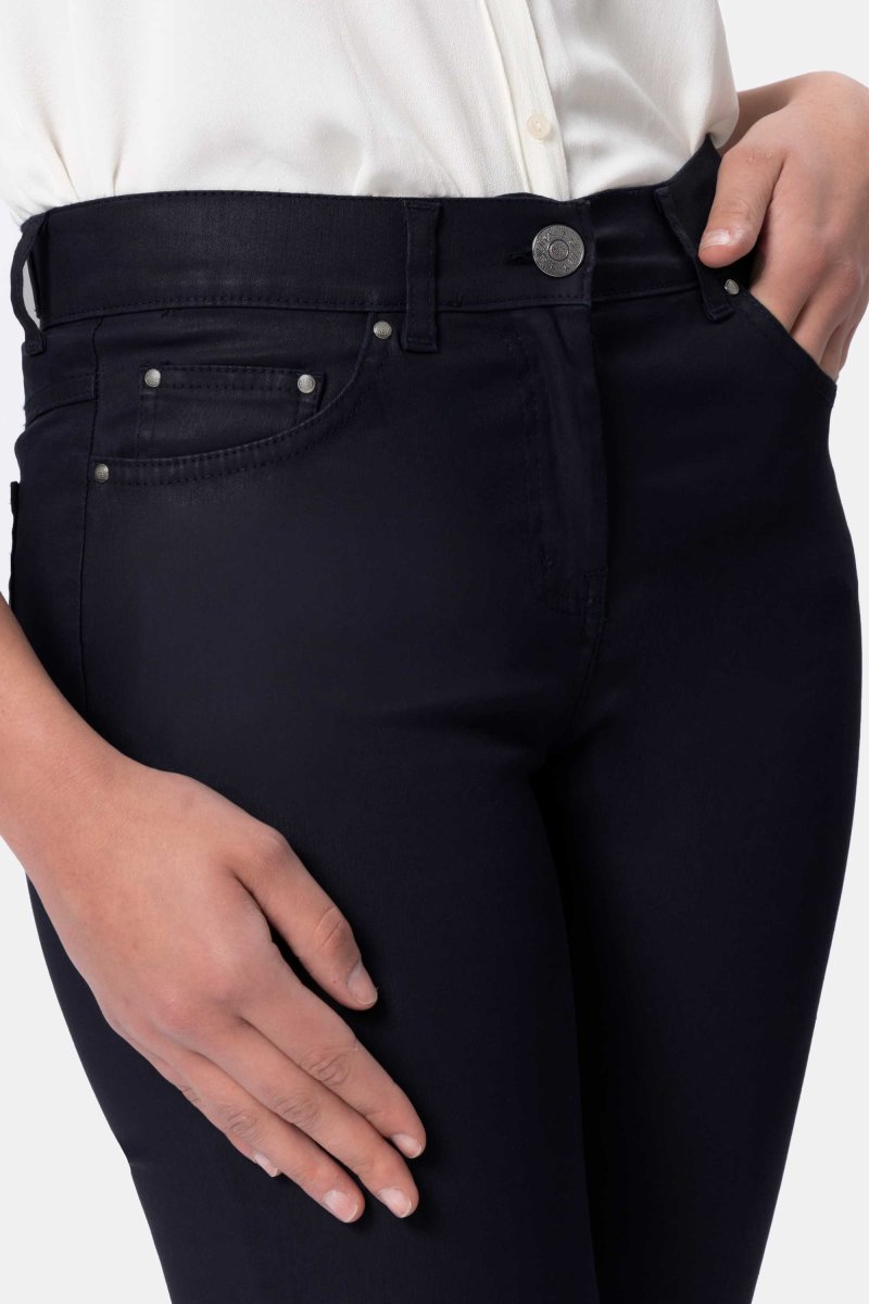 Jeans in tessuti effetto pelle stretch con vestibilitร regolare. Questo modello รจ costruito con vita media elasticizzata, chiusura con zip e bottone, pratiche tasche con dettaglio strass sul retro. Un jeans di tendenza e un must have da avere assolutamente nel proprio armadio