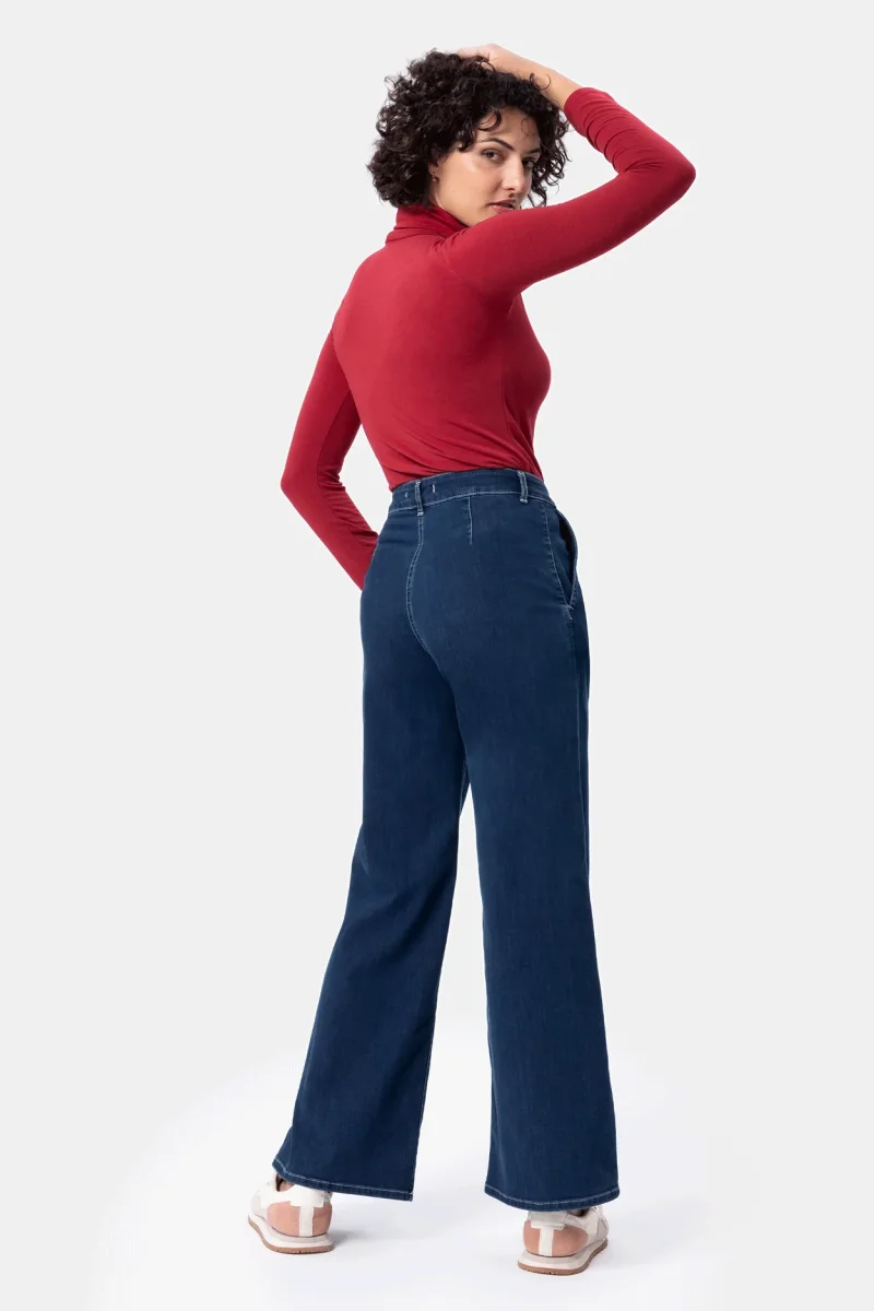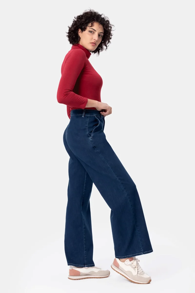 Jeans in denim blu super stretch con vestibilitร palazzo e gamba ampia. Questo modello รจ costruito con vita regolare elasticizzata, chiusura con zip e bottone. Un pantalone attuale, comodo e per ogni occasione, da quelle piรน quotidiane a quelle piรน eleganti. Abbinalo alla scarpa giusto e sarร un capo essenziale per questa stagione, facendoti sentire attuale e alla moda.