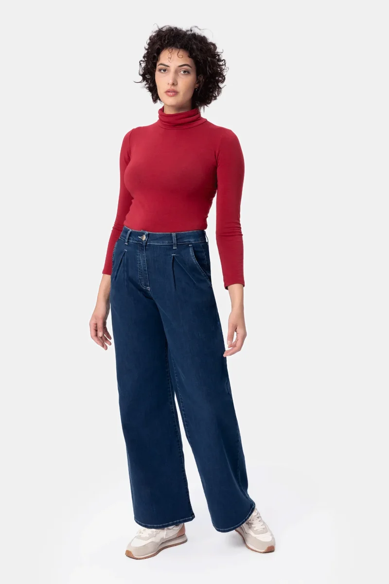 Jeans Donna wide leg Denim super stretch Peso tessuto: 4 Stagioni Jeans in denim blu super stretch con vestibilitร palazzo e gamba ampia. Questo modello รจ costruito con vita regolare elasticizzata, chiusura con zip e bottone. Un pantalone attuale, comodo e per ogni occasione, da quelle piรน quotidiane a quelle piรน eleganti. Abbinalo alla scarpa […]