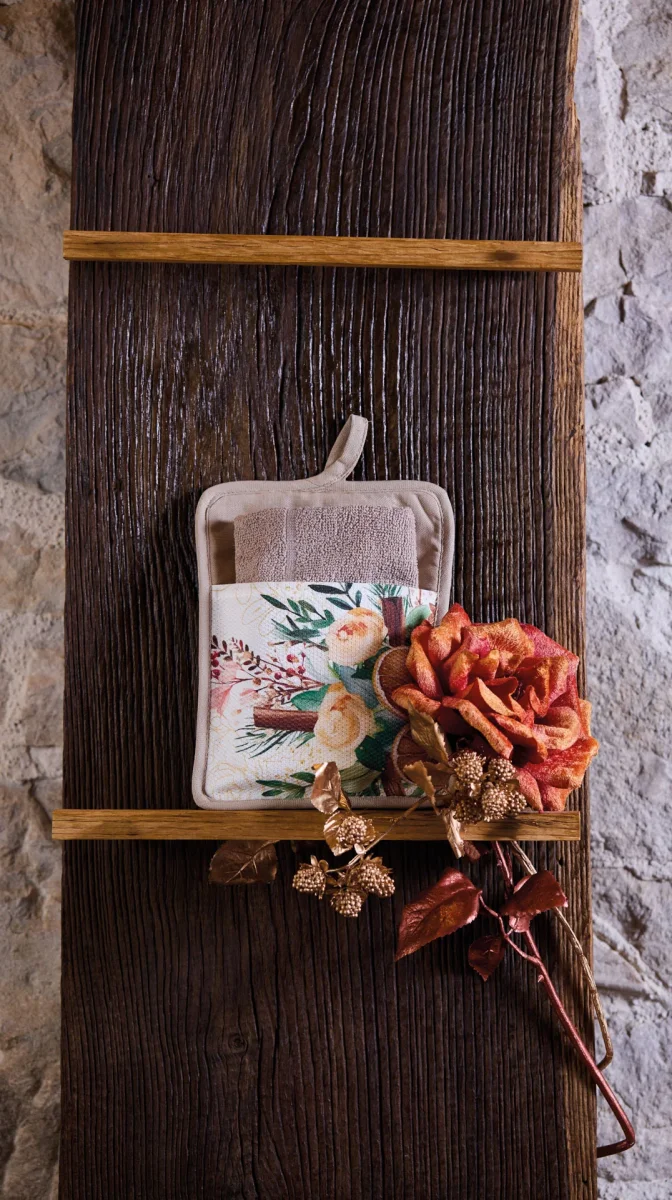 DETTAGLI Porta i colori caldi dell’autunno nella tua cucina con questa raffinata maxi presina della collezione Profumi d’Autunno. Caratteristiche: Design a doppia funzione: presina e canovaccio in un unico accessorio Interno in morbida spugna beige che garantisce assorbenza e protezione dal calore Esterno decorato con eleganti composizioni floreali autunnali: rose pesca, foglie verdi e bacche […]