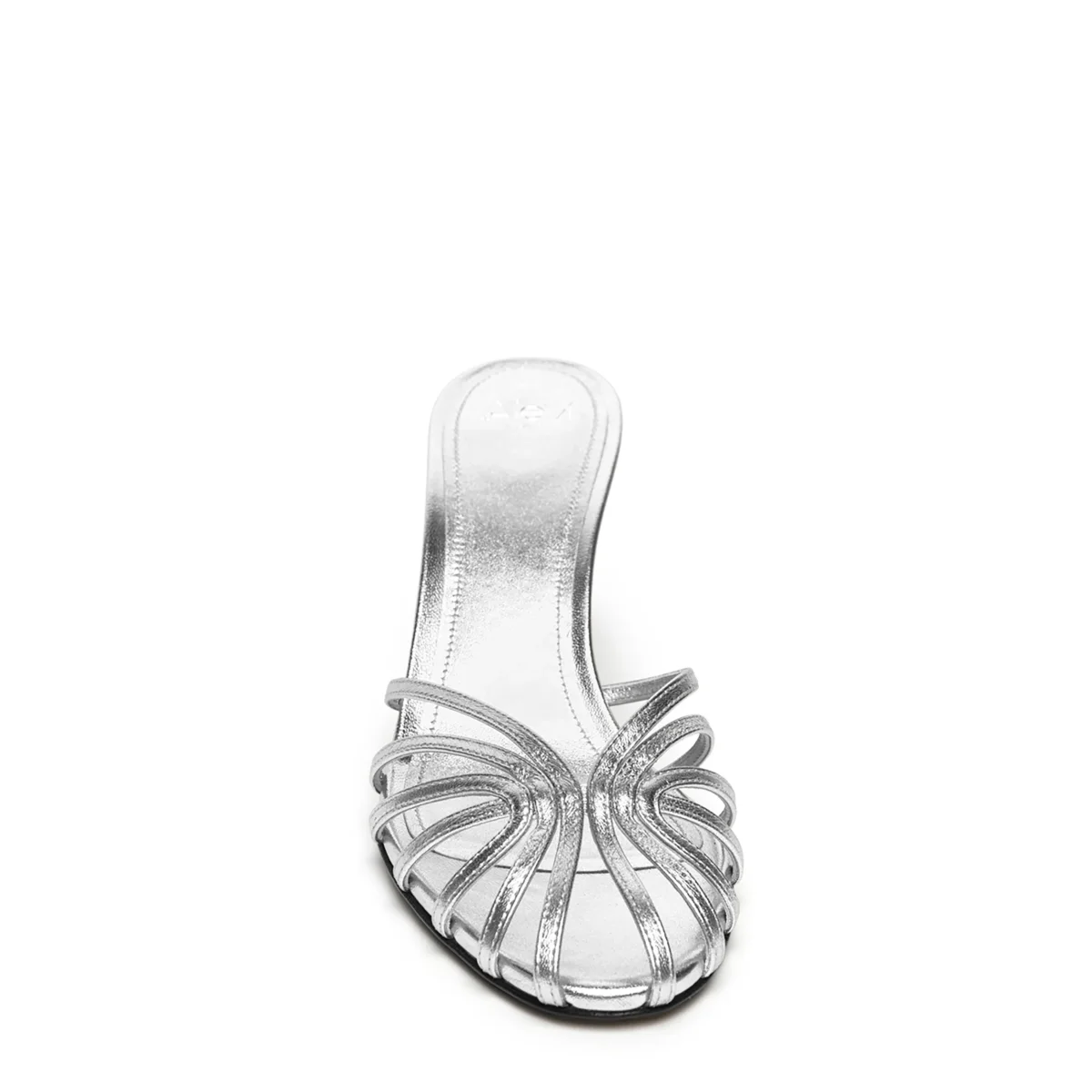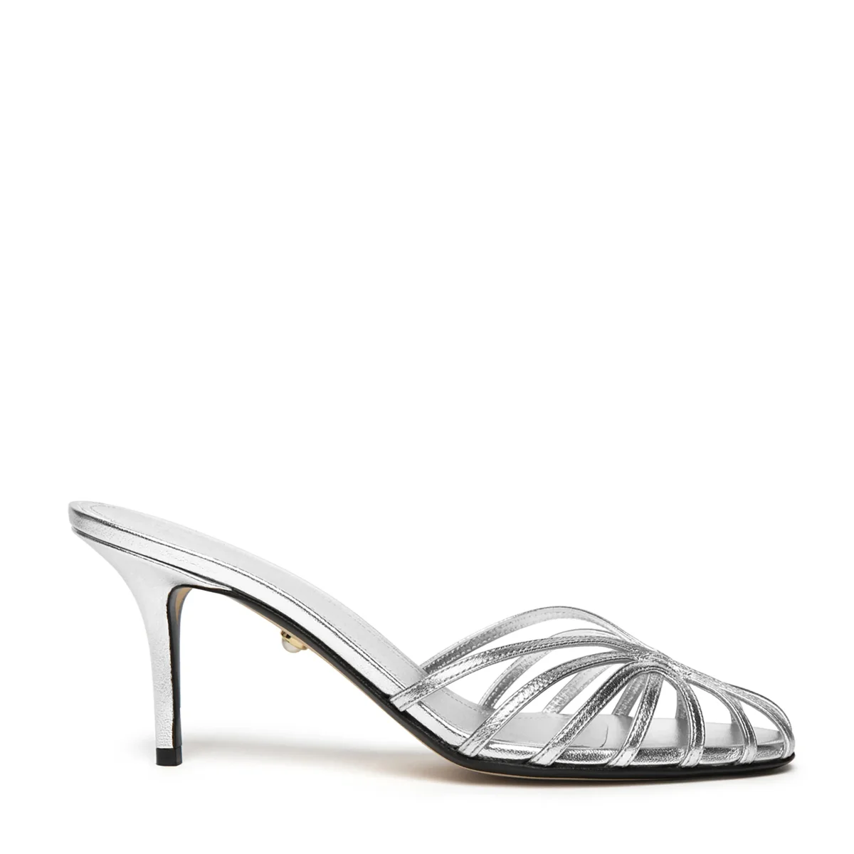 Sabot gabbia in pelle laminata. Tacco laccato in tono.