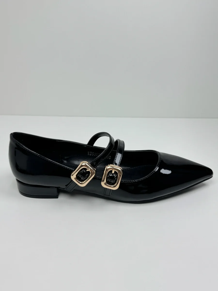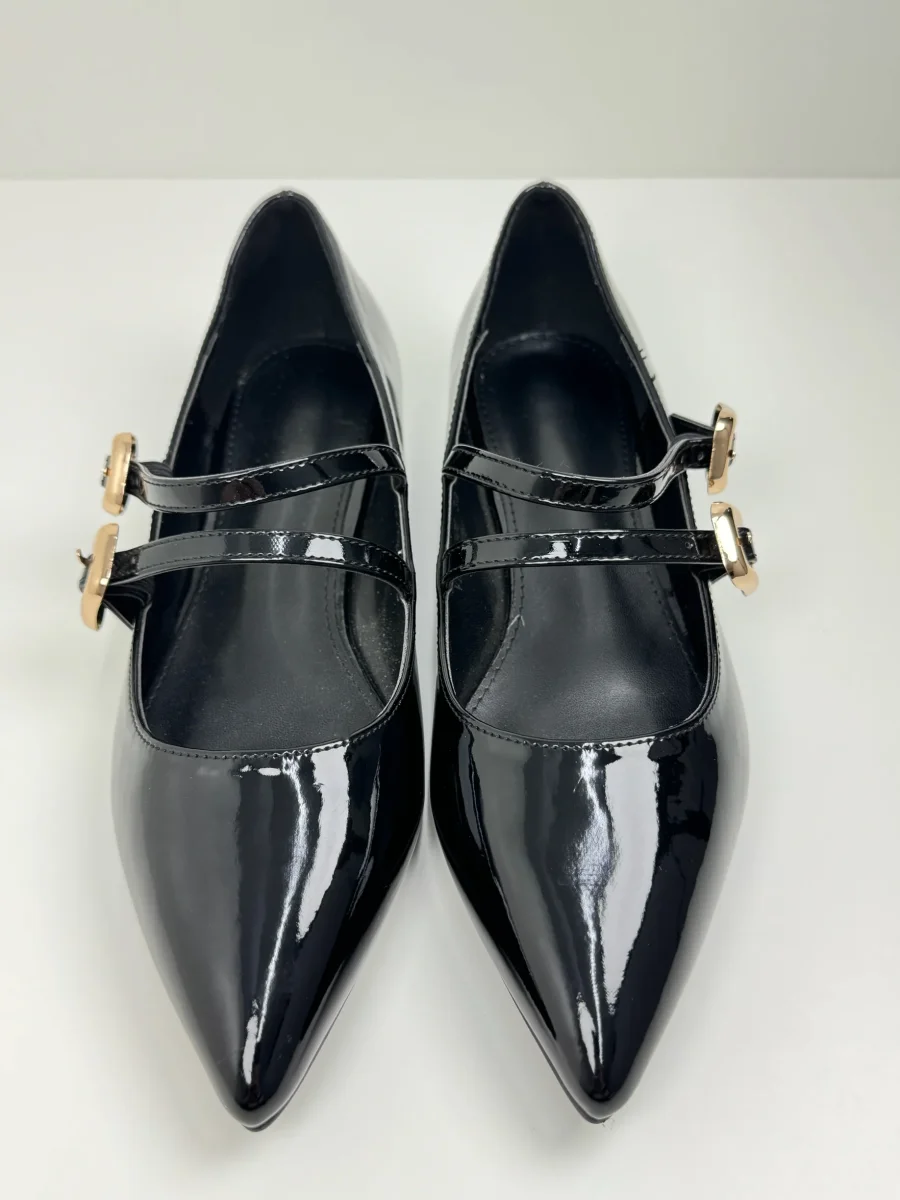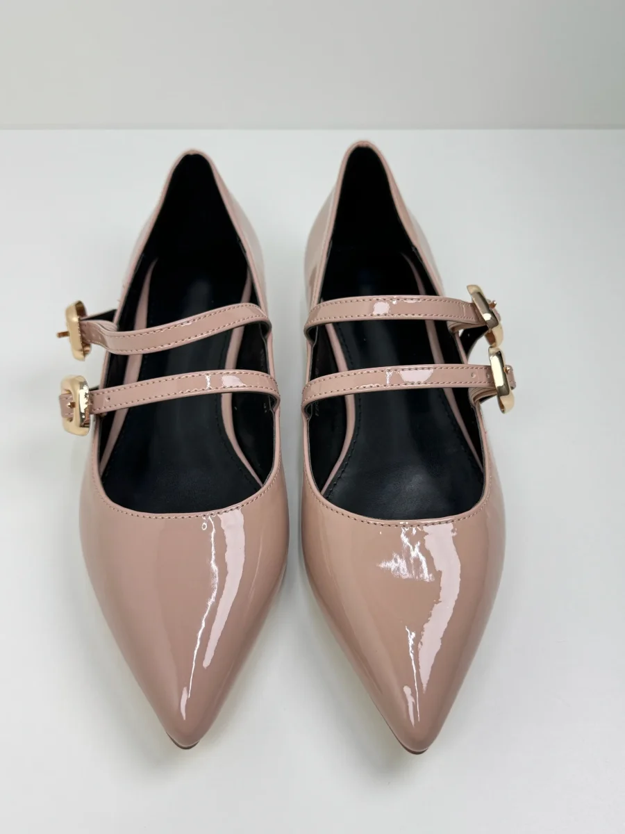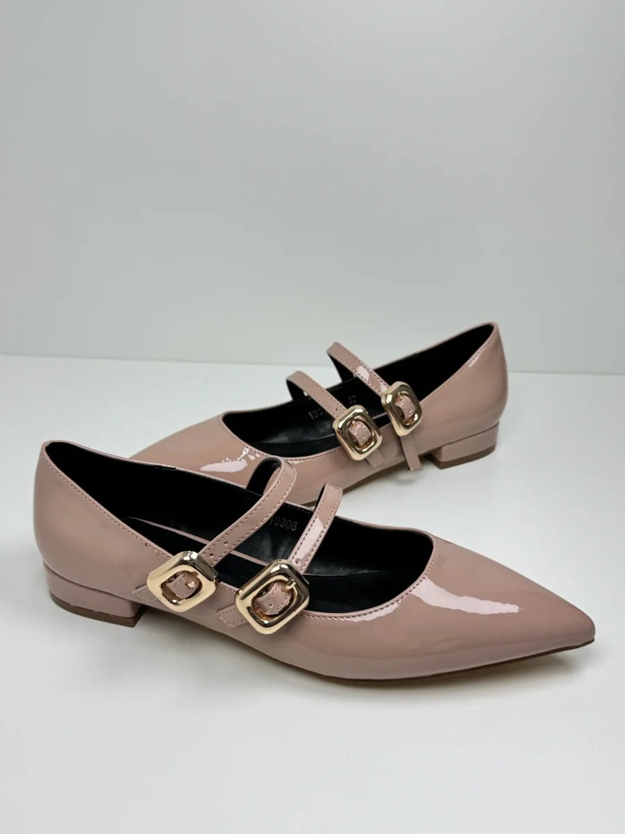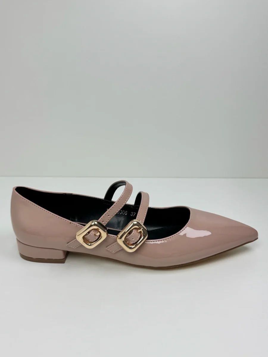 Le nostre ballerine Mimi sono realizzate in lucida vernice, con tomaia a punta e fibbie in oro. Disponibili in Nero e Beige Rosato. Tacco 2 cm Calzata Regolare