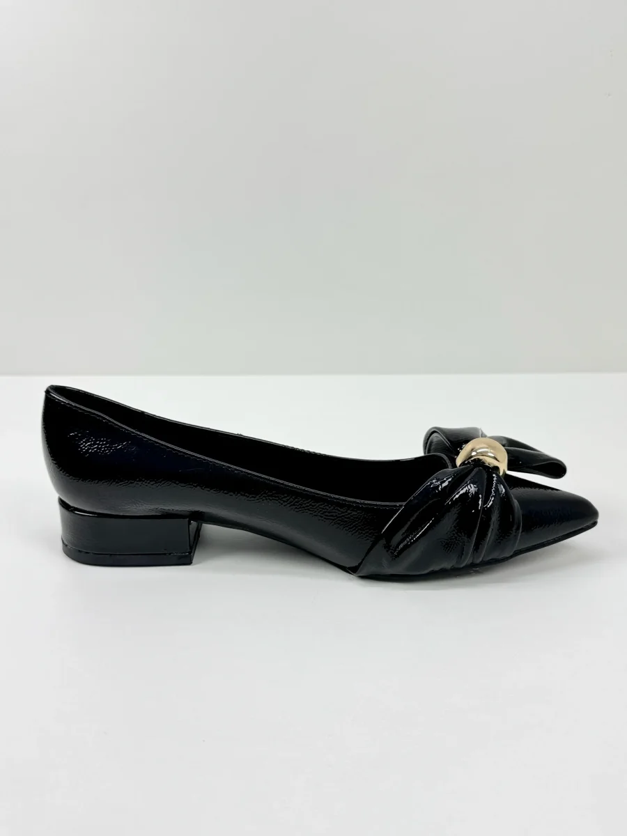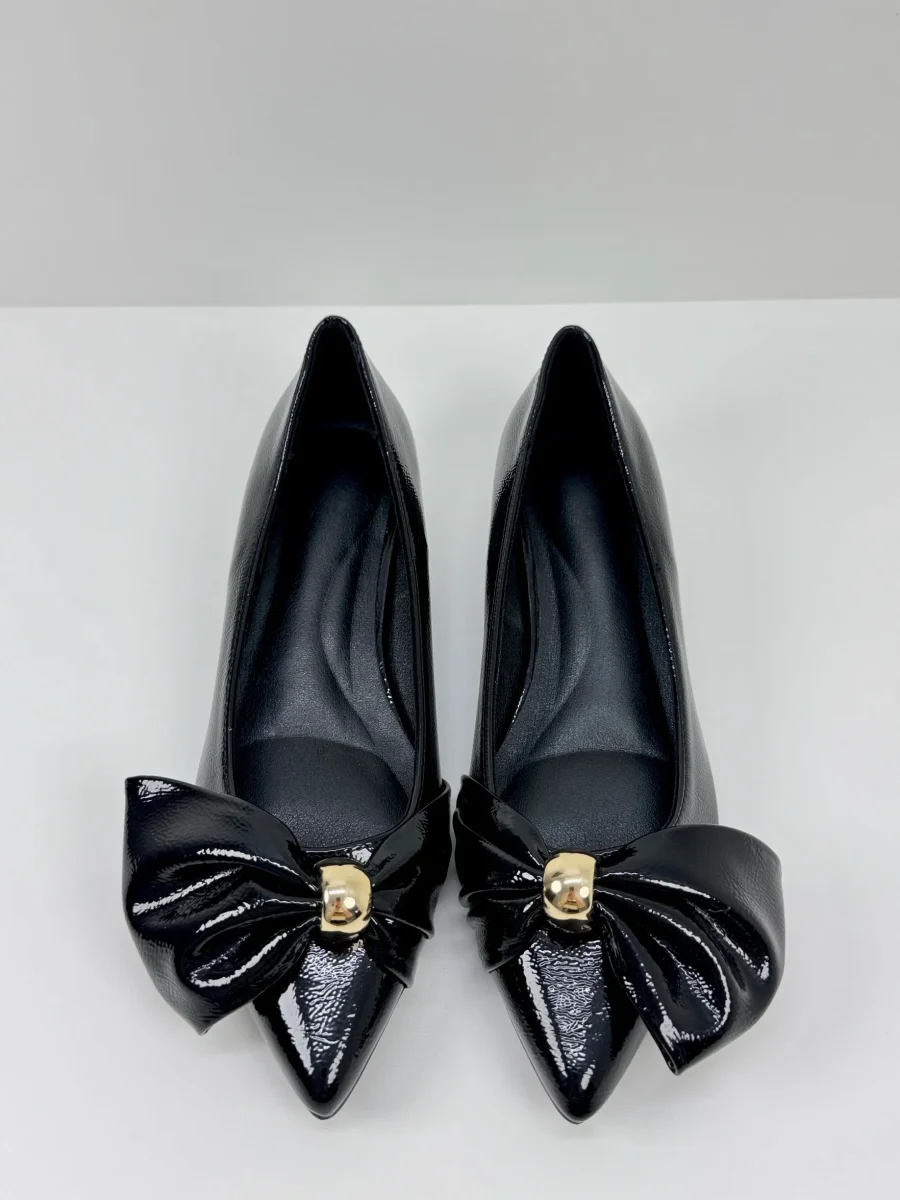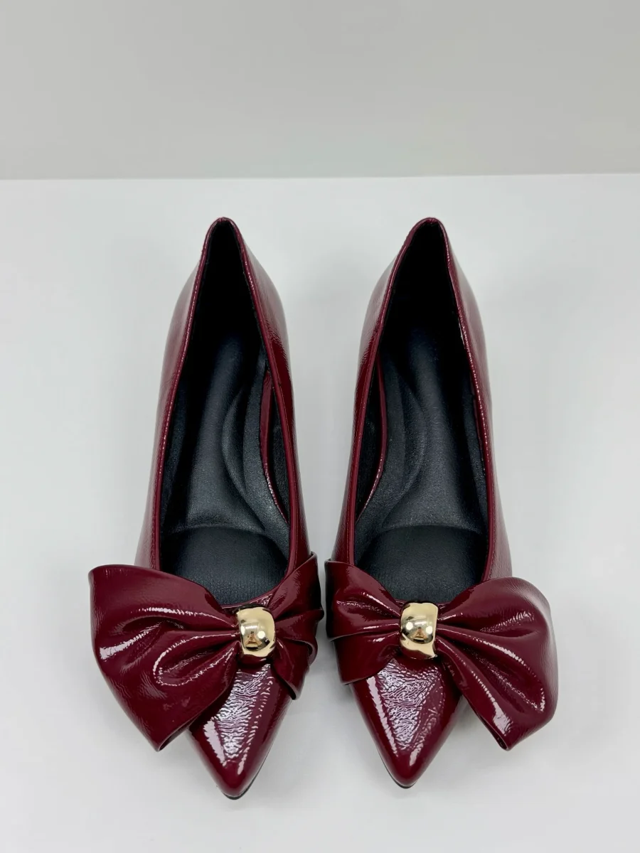 Eleganti e confortevoli, queste ballerine in vernice Bordeaux e Nere, sono impreziosite da un maxi fiocco con dettaglio dorato. Il sottopiede morbido assicura comfort per tutto il giorno, mentre la punta affusolata e il piccolo tacco donano un tocco raffinato a ogni outfit. Tacco 3 cm Calzata Regolare