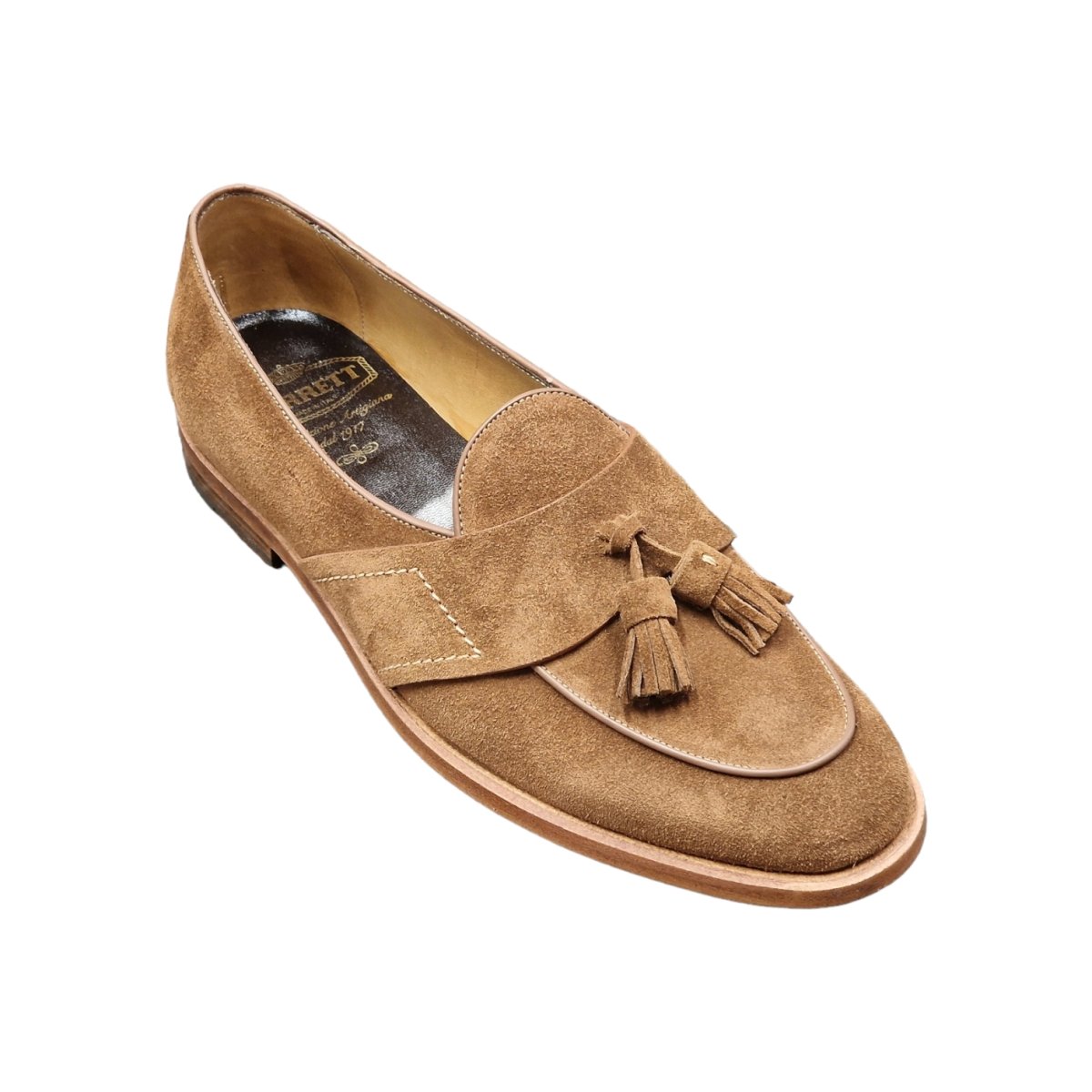 Mocassino scollato, realizzato in morbidissimo suede, color cuoio. Il modello si caratterizza ย dal dettaglio delle nappine. Perfetto per la bella stagione, da indossare ogni giorno grazie al comfort del pellame e alla struttura leggerissima che lo caratterizza. La Suola in cuoio e mezza suoletta in gomma.
