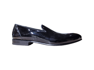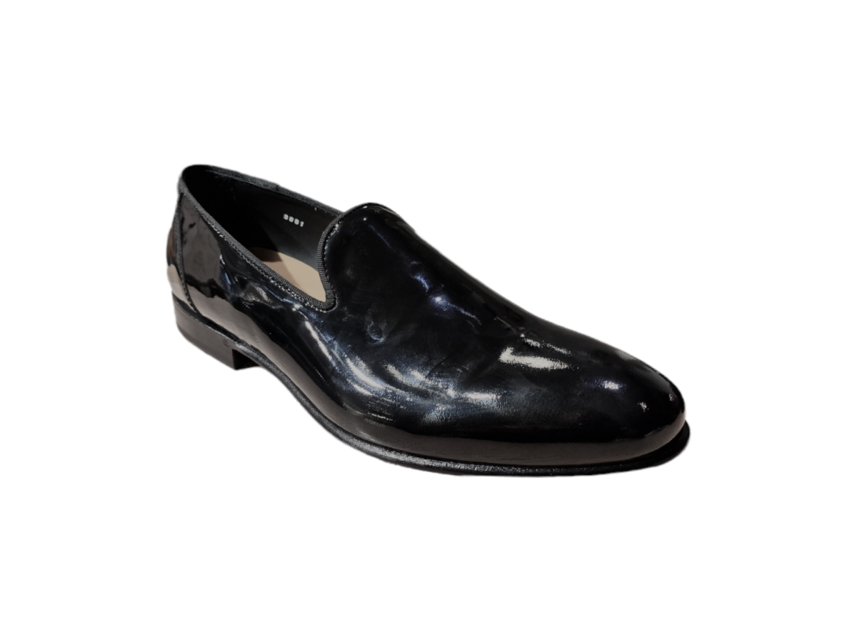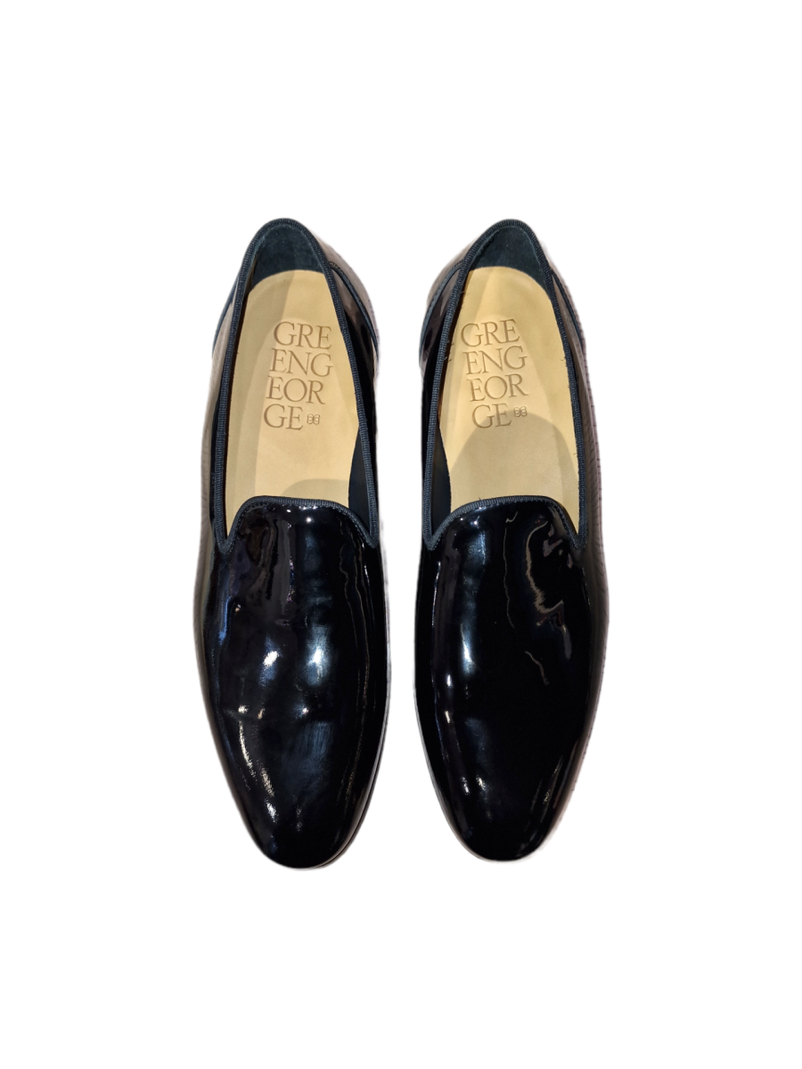Mocassini slip on da uomo firmati Green George realizzati in pregiata vernice nera, punta affusolata e suola e tacco in cuoio.