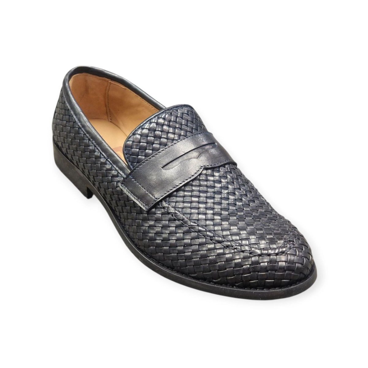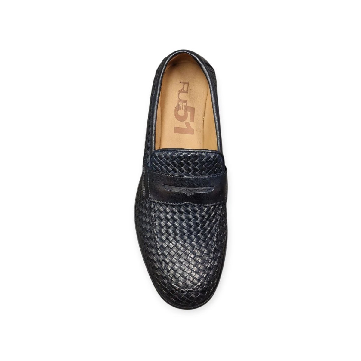Raffinati ed eleganti, i mocassini Marechiaro “Rue 51” spiccano grazie alla tomaia in vitello intrecciato blu e la suola in cuoio con gomma antiscivolo. Sono realizzati con cura in Italia e presentano una comoda silhouette con punta arrotondata e suola in cuoio. Indossali con completi sartoriali contemporanei, sia di giorno che di sera.