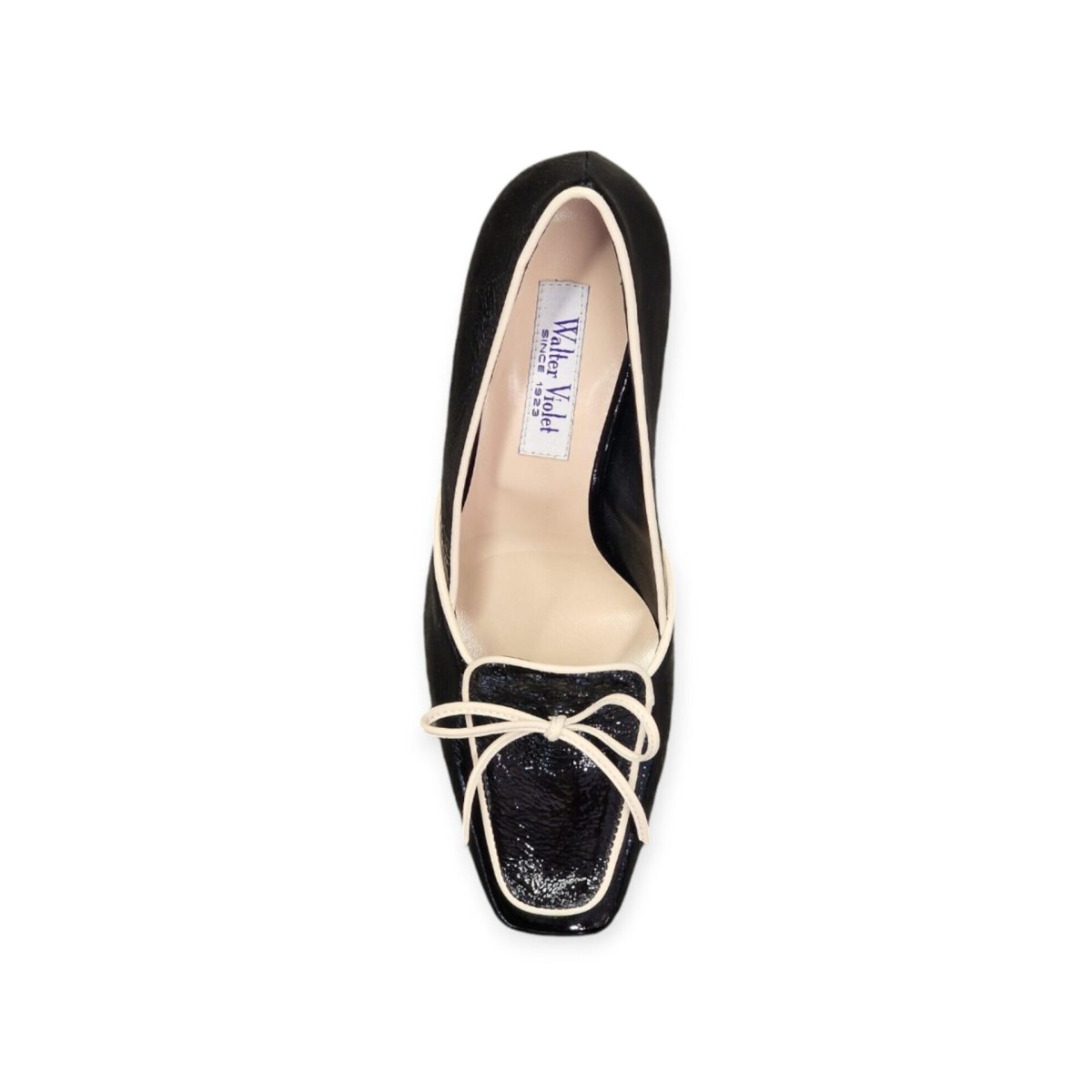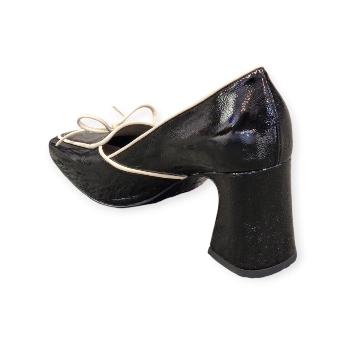 Mocassino in vernice con profili in pelle a contrasto bianco che terminano con un fiocco. Tacco alto rivestito e scolpito.