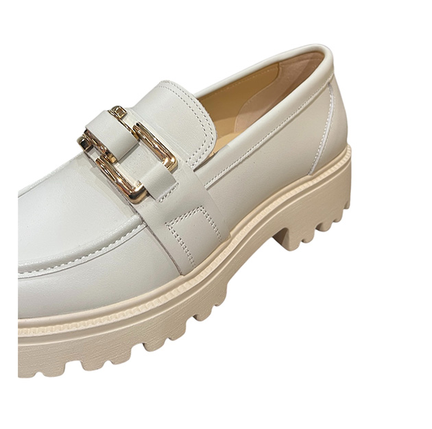 Mocassino donna avorio, con accessorio metallico in monta e fondo leggero a carrarmato in gomma. Stile glam.