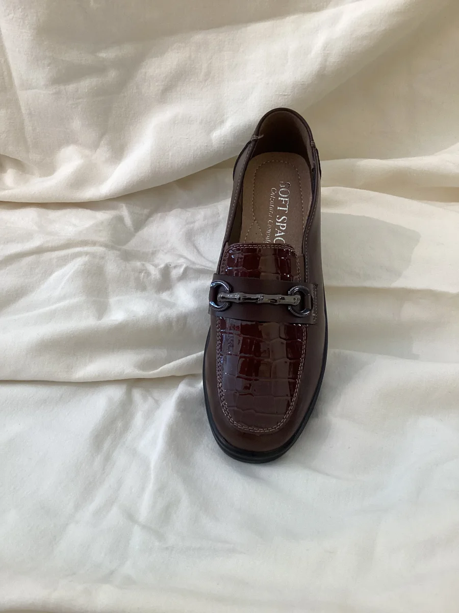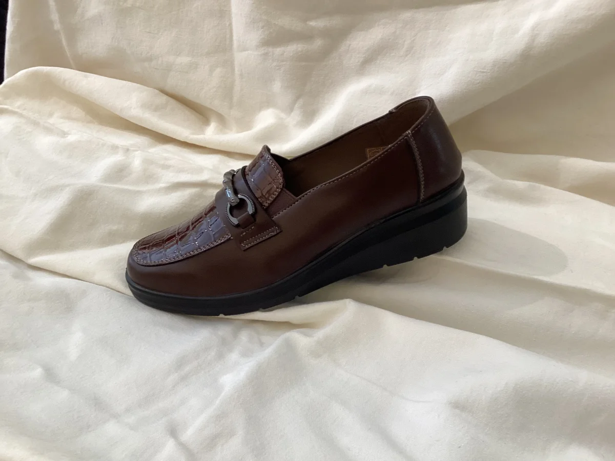 Se stai cercando un mocassino della linea comoda, perfetto da abbinare con outfit sia casual che eleganti questa calzatura รจ perfetta. Colore marrone con lavorazione lucida che si avvicina otticamente al bordeaux. Fibbia molto carina effetto bambรน. Morbido plantare in memory. Fondo a zeppa nero.