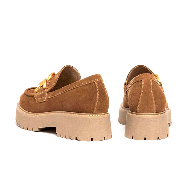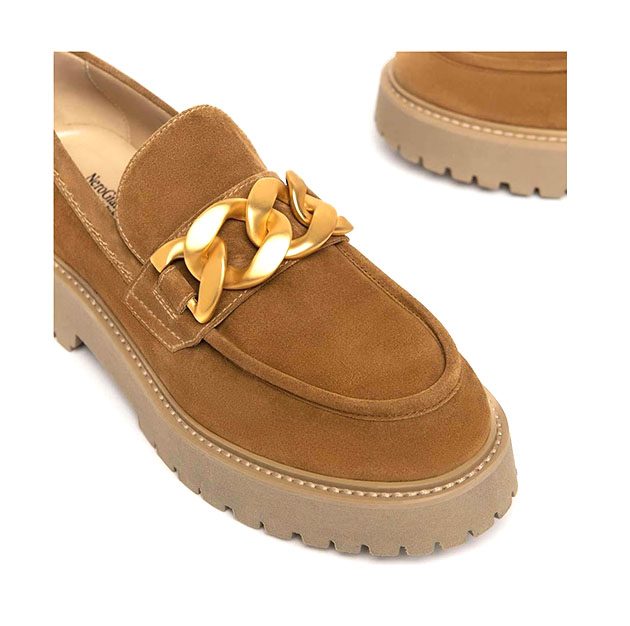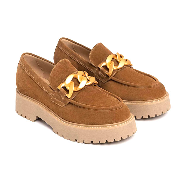 Mocassino Donna malto in camoscio, impreziosito da dettaglio metal sulla parte anteriore, e fondo a contrasto di colore. Design sofisticato per un look glam. Made in Italy.