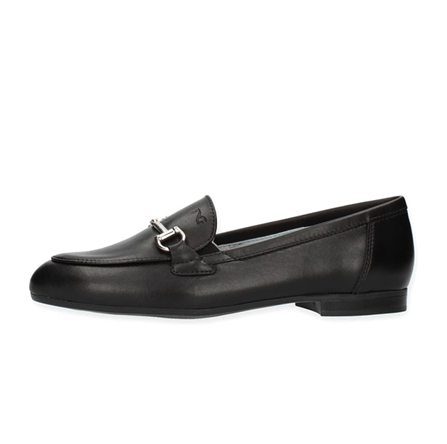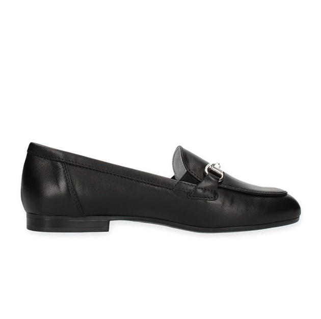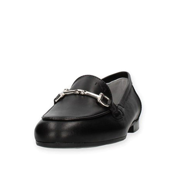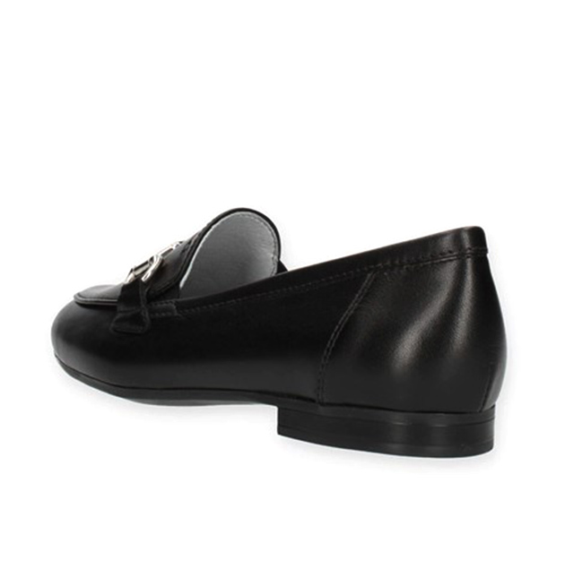 Mocassino Donna nero in pelle, con tacco basso e punta a mandorla. Morsetto in metallo sul davanti. Logo impresso sulla linguetta. Stile glam per questa scarpa adatta ad ogni outfit. Made in Italy.