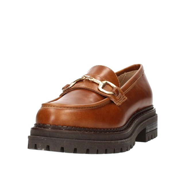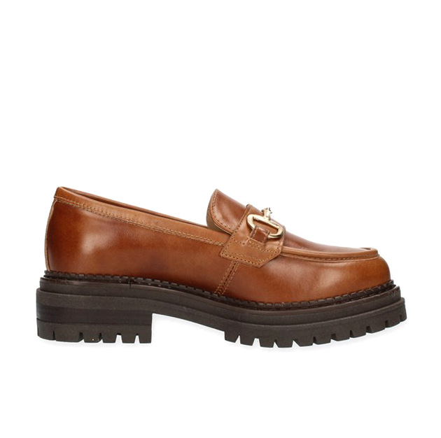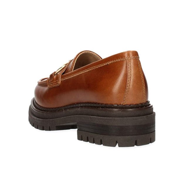 Mocassino Donna cuoio in pelle, impreziosito da dettaglio metal sulla parte anteriore, e fondo a contrasto di colore. Design sofisticato per un look glam. Made in Italy.