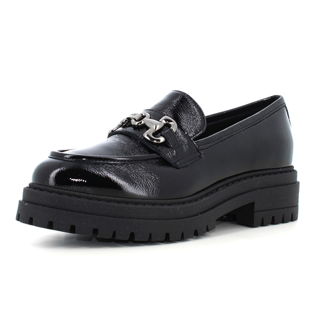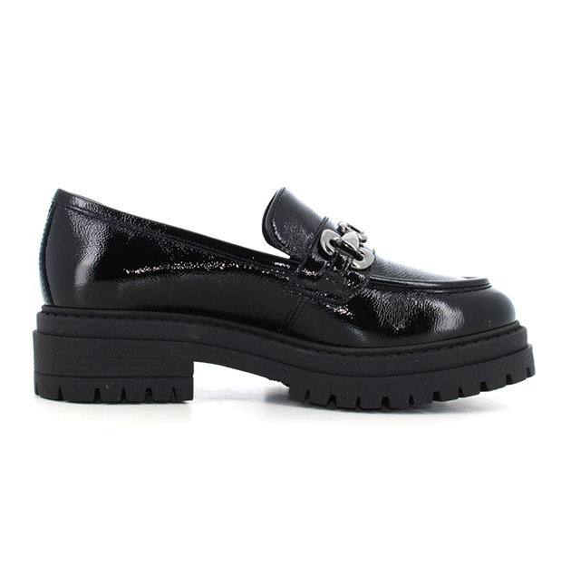 Mocassino Donna nero in vernice, con con morsetto satinato e suola carrarmato in gomma. Design sofisticato per un look glam. Made in Italy.