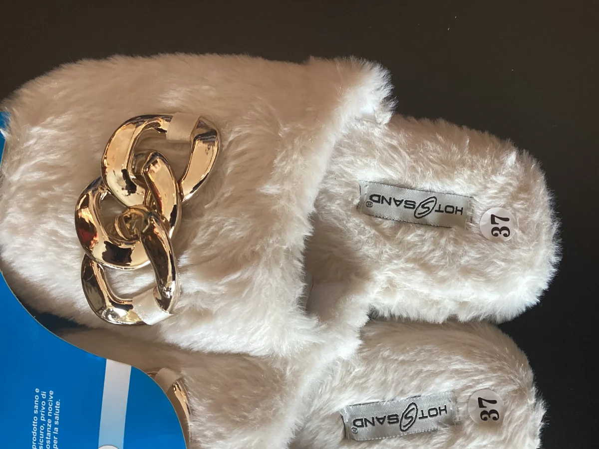 Tutta in ecopelliccia, con applicazione a catena color oro. Tanto calda quanto morbida e confortevole. Suola bassa in gomma antiscivolo