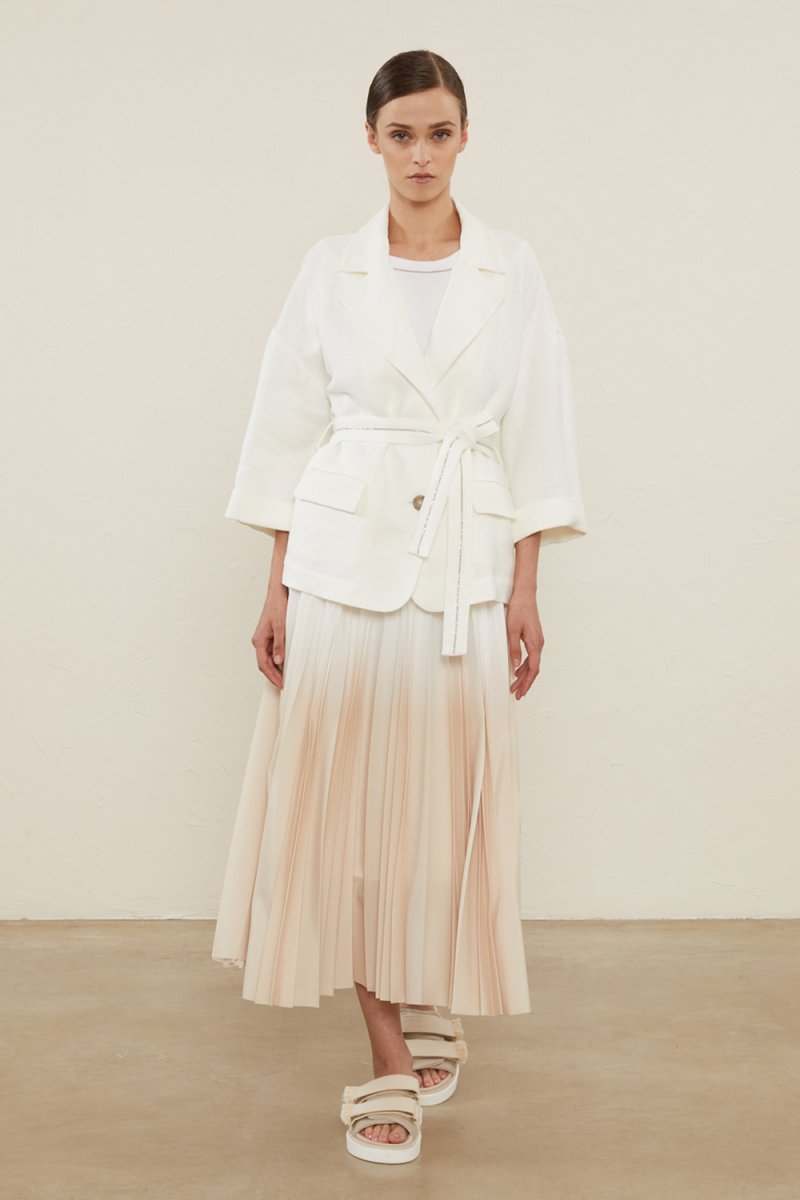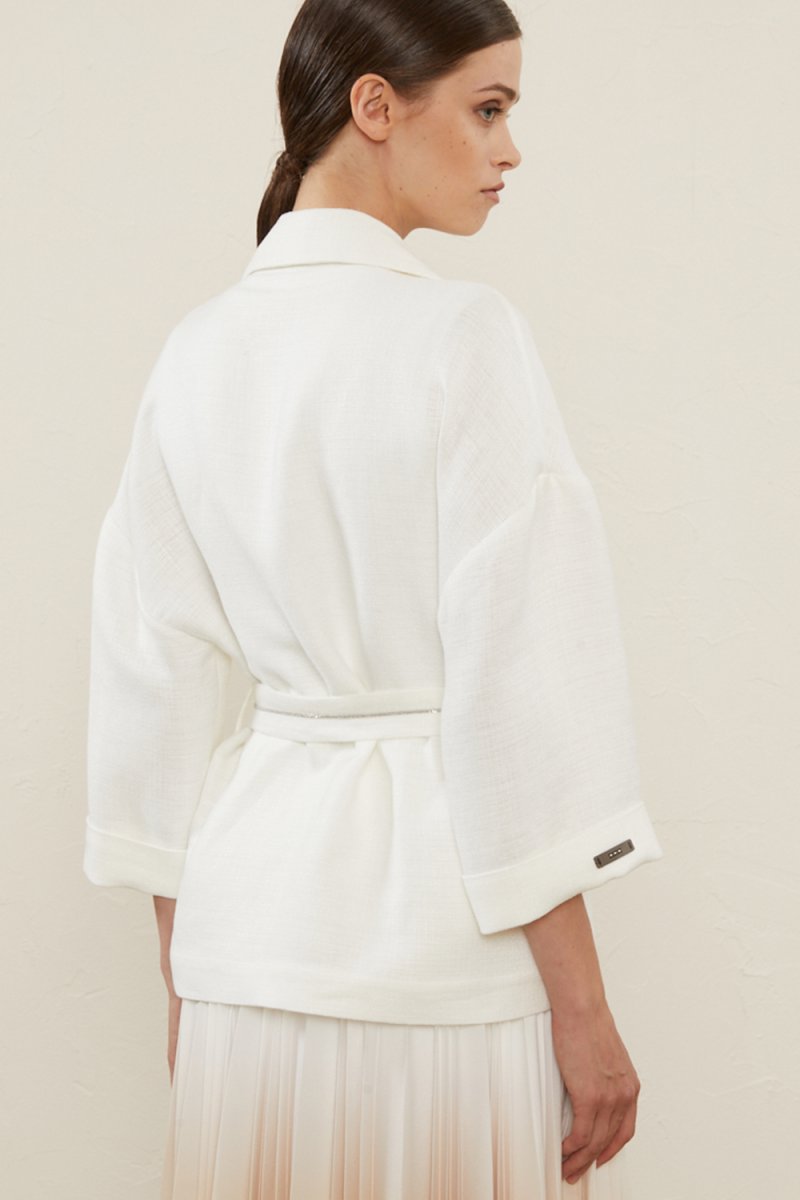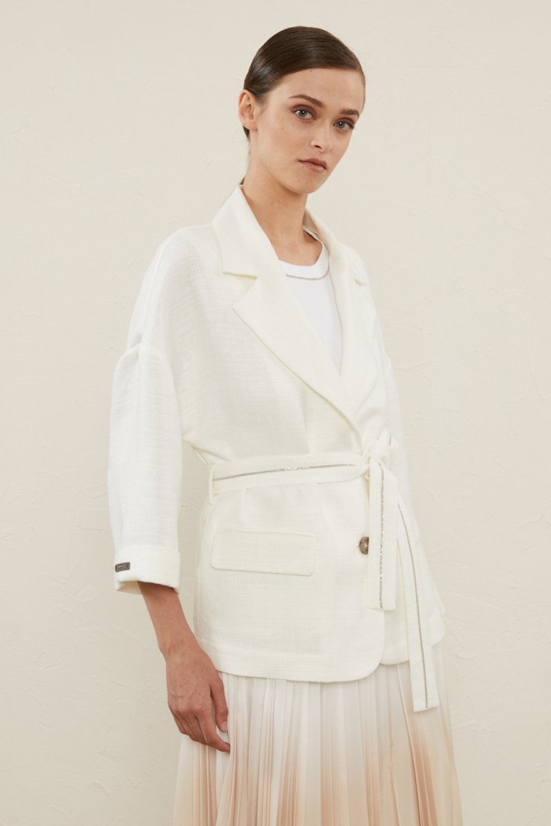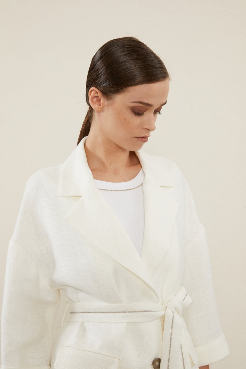 Giacca in Stola di lino e viscosa fluida chiusuraย a libro arricchita da una cintura tono su tono impreziosita da dettagli in monile