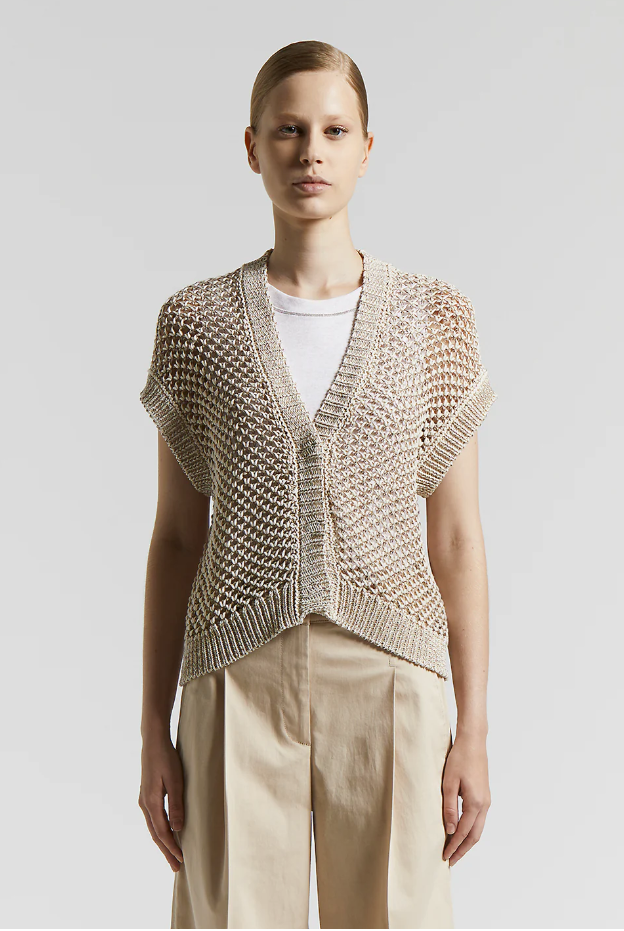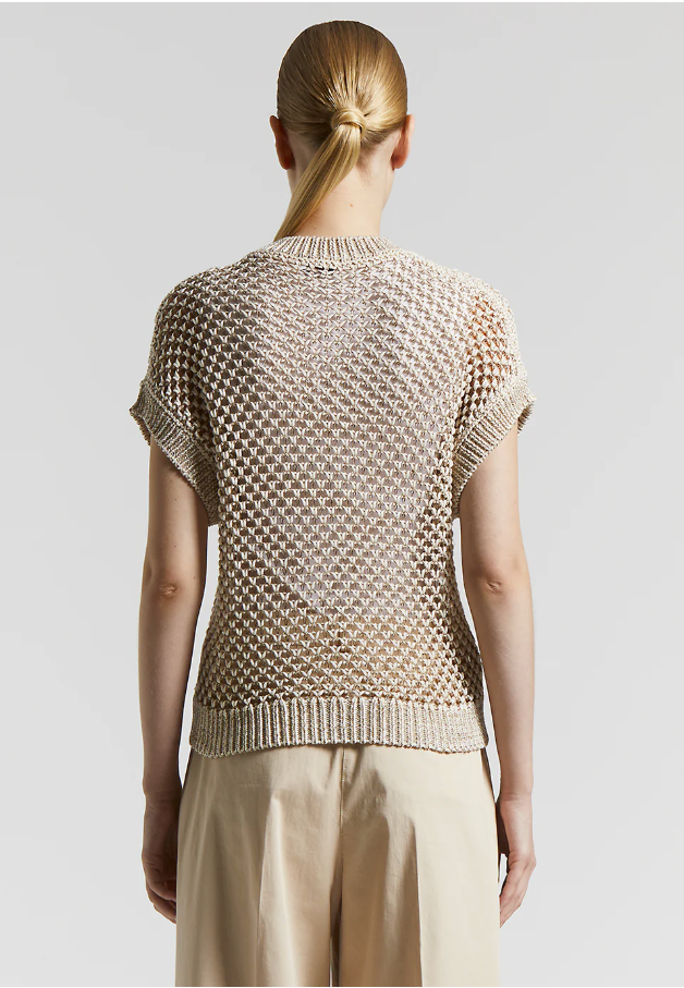 Questa maglia in tricot incarna alla perfezione lessenza di un lusso discreto e raffinato. Realizzata in soffice filato di cotone, presenta una speciale lavorazione a rete bicolore che conferisce un effetto arioso e di classe. Ideale per la primavera e per le fresche serate estive, รจ caratterizzata da maniche corte a kimono e un femminile […]