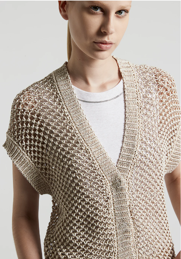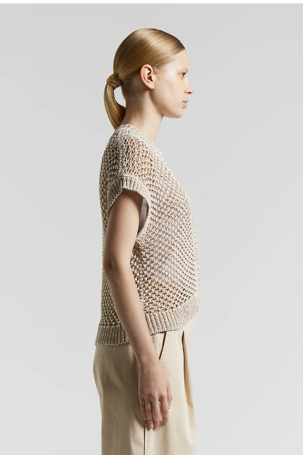 Questa maglia in tricot incarna alla perfezione lessenza di un lusso discreto e raffinato. Realizzata in soffice filato di cotone, presenta una speciale lavorazione a rete bicolore che conferisce un effetto arioso e di classe.