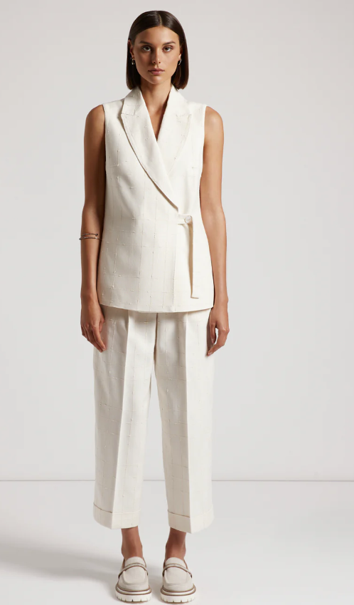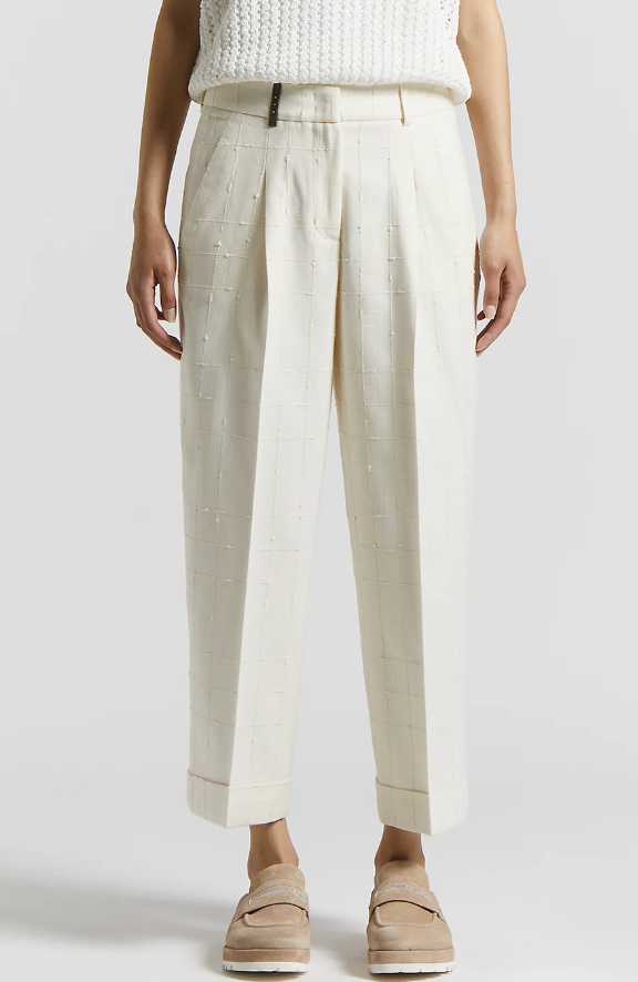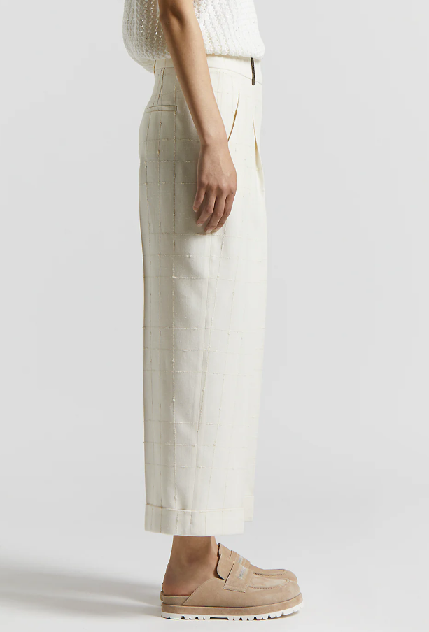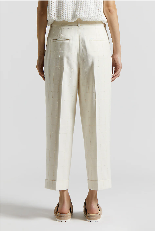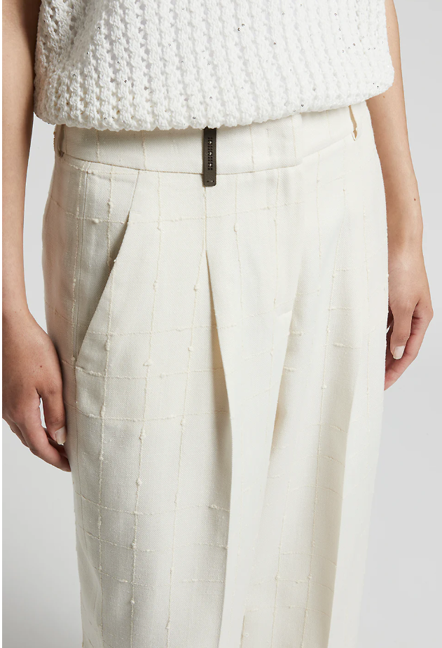 Un’intrigante combinazione di eleganza e raffinatezza, questi pantaloni con pinces sono realizzati in stuoia con motivo finestrato bouclè ton sur ton. La texture del tessuto, ricca e morbida, regala una sensazione di comfort unica.