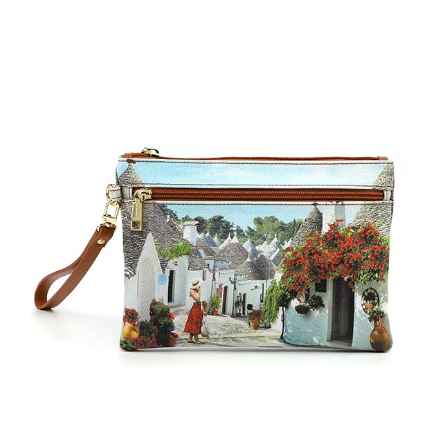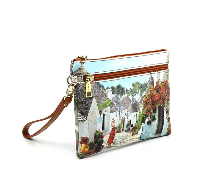 Pochette in goffrato multicolor, modello pratico e urban, da portare a mano o con il pratico polsino. Sulla collezione Yes Bag vengono rappresentate cittร italiane e internazionali attraverso istantanee e dettagli iconici. L’interno รจ foderato in tessuto loggato, 1 scomparto con tasche porta oggetti e con zip, 1 tasca esterna con zip per avere tutto a portata di mano.