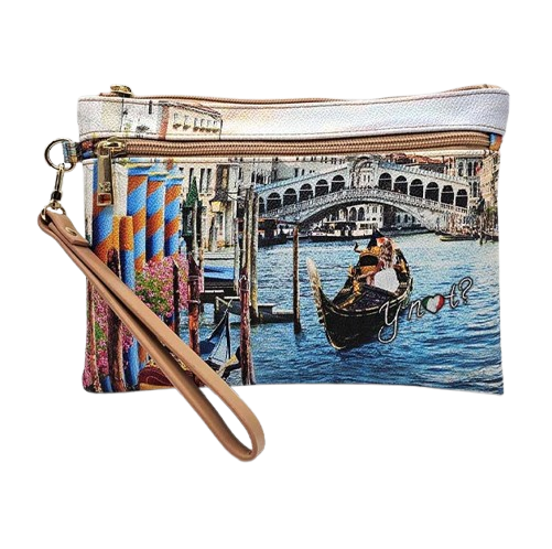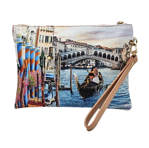 Pochette Donna in goffrato tema Venezia. Da indossare come pochette o clutch. Laccio per il polso Chiusura con zip Fodera interna