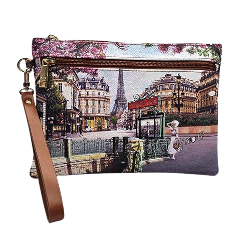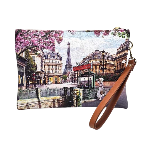Pochette Donna in goffrato tema Parigi. Da indossare come pochette o clutch. Laccio per il polso Chiusura con zip Fodera interna