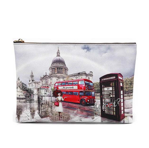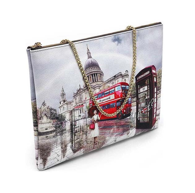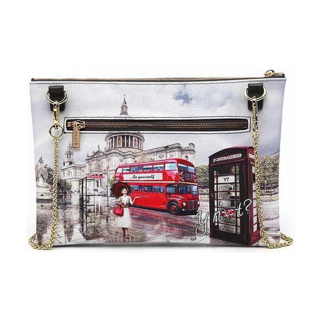 Pochette Donna multicolor in goffrato, con stampa Londra. Chiusura con cerniera lampo e tasca posteriore con zip. Tracolla in catena, interno foderato con tasca zip.