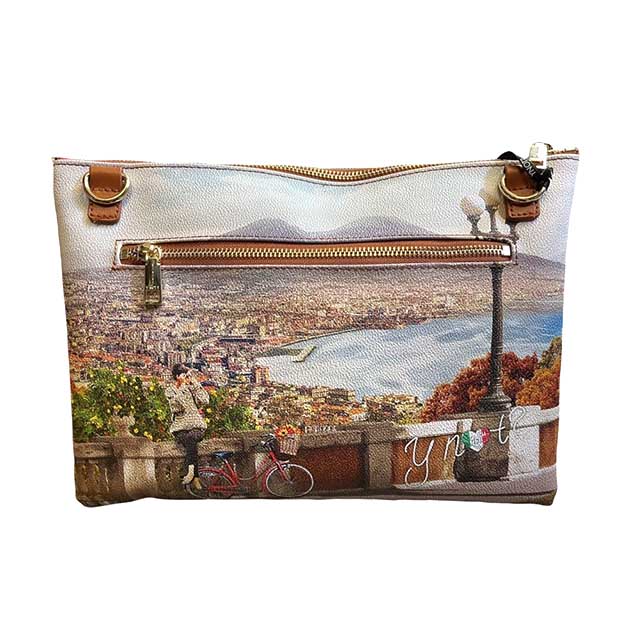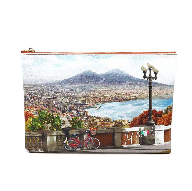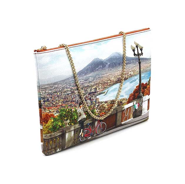 Pochette Donna multicolor in goffrato, con stampa Golfo di Napoli. Chiusura con cerniera lampo e tasca posteriore con zip. Tracolla in catena, interno foderato con tasca zip.