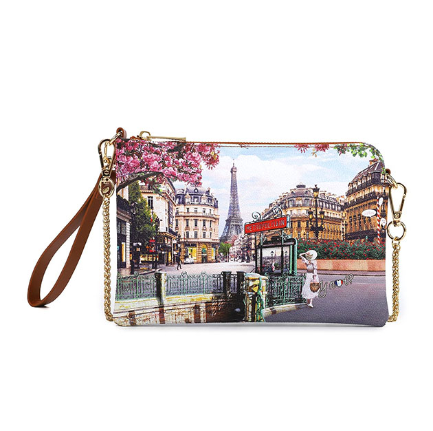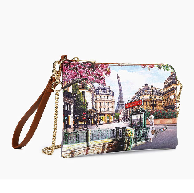 Pochette small Donna in goffrato tema Parigi, con doppia portabilitร a mano e a tracolla. Dotata di polsiera in pelle e tracolla a catena. Unico scomparto foderato e organizzato chiuso con zip. Pendente Charm . Un accessorio must-have per le tue uscite in cittร . Piccola, leggera e versatile, si porta a spalla o crossbody, aggiungendo un tocco di stile a qualsiasi outfit.
