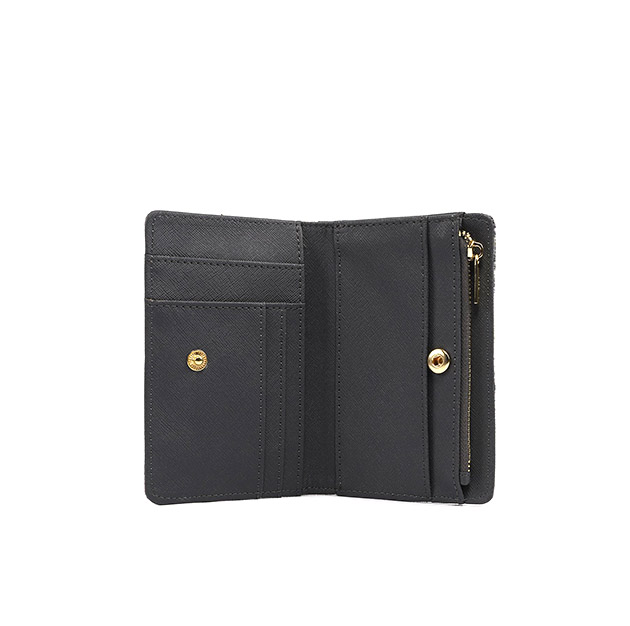 Portacarte e portamonete Donna in goffrato multicolor, con apertura a libro e chiusura con bottone a pressione e una tasca esterna .Internamente ci sono uno scomparto con chiusura zip per le monete e sei scomparti per carte o documenti.