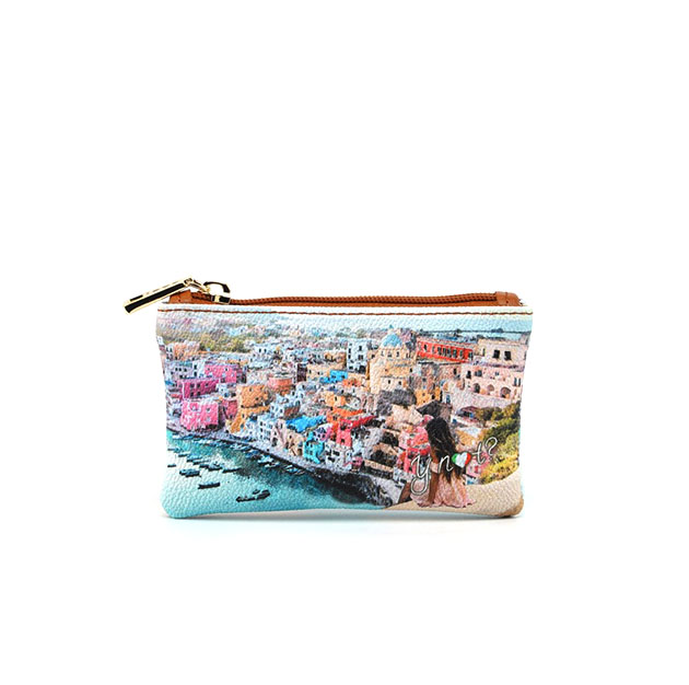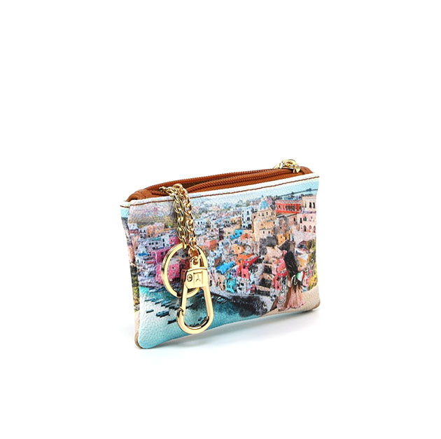 Portachiavi Y not? Donna in goffrato con stampa cittร , chiusura con cerniera lampo. All’interno รจ dotato di moschettone e anello.
