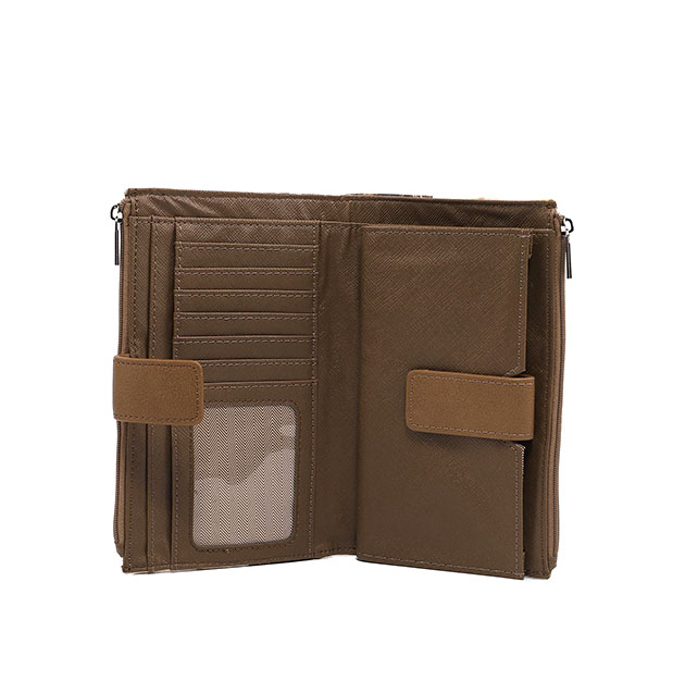 Portafoglio donna in ecopelle tortora con stampa, leggero e compatto con tracollina in catena. Caratteristiche: due zip; 7 scomparti per carte; 3 tasche di cui una chiusa cin bottoncino.