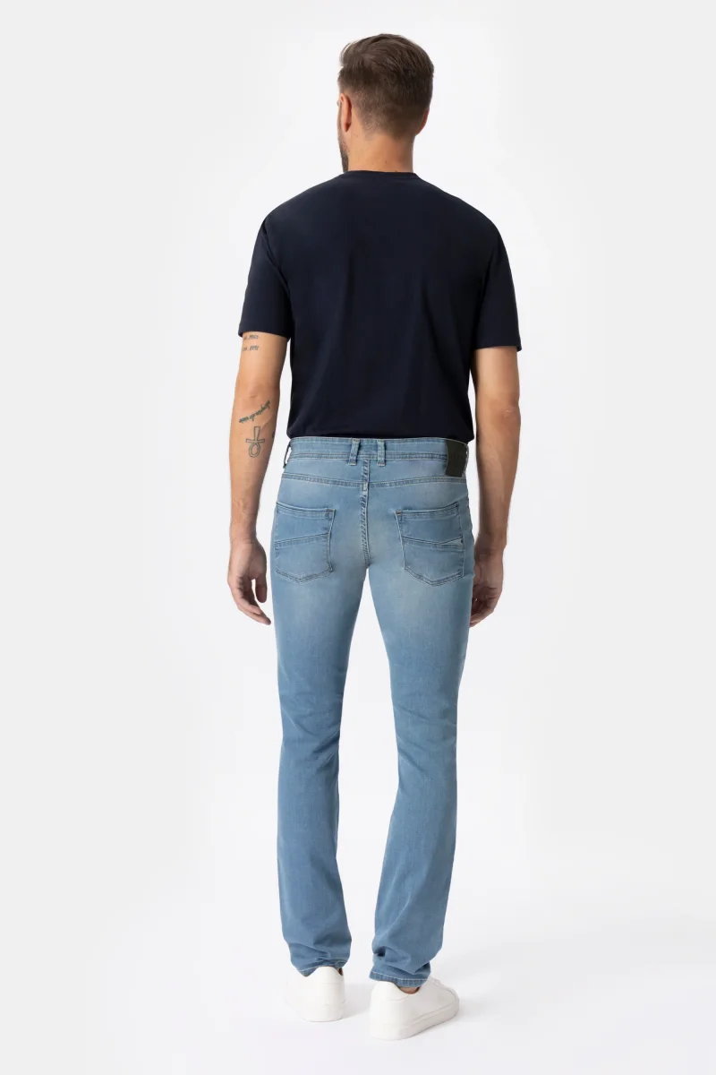 Jeans in denim blue di cotone dalla vestibilitร slim con tessuto elasticizzato. Modello 5 tasche con chiusura bottone e zip, dettaglio tasca frontale. Il jeans รจ caratterizzato da un taglio sulla tasca dietro che lo rende grintoso e moderno. Comodo e pratico, ideale per il look di tutti i giorni.