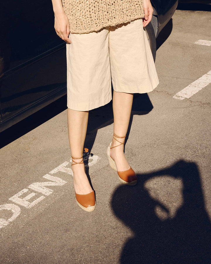 Espadrilla Carina in nappa con chiusura a lacci in pelle, soletta imbottita e zeppa in juta di 90 mm.