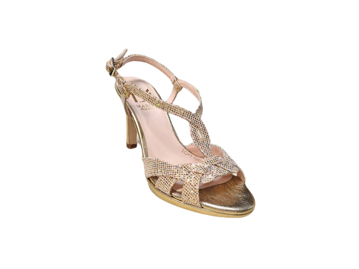 Particolare ed elegante il sandalo รฉ realizzato in glitterย oro ,foderato in pelle con fibbia, suola in cuoio adatta per ogni pavimento, cuscinetti di confort interni, tacco fasciato in oro 90 mm.