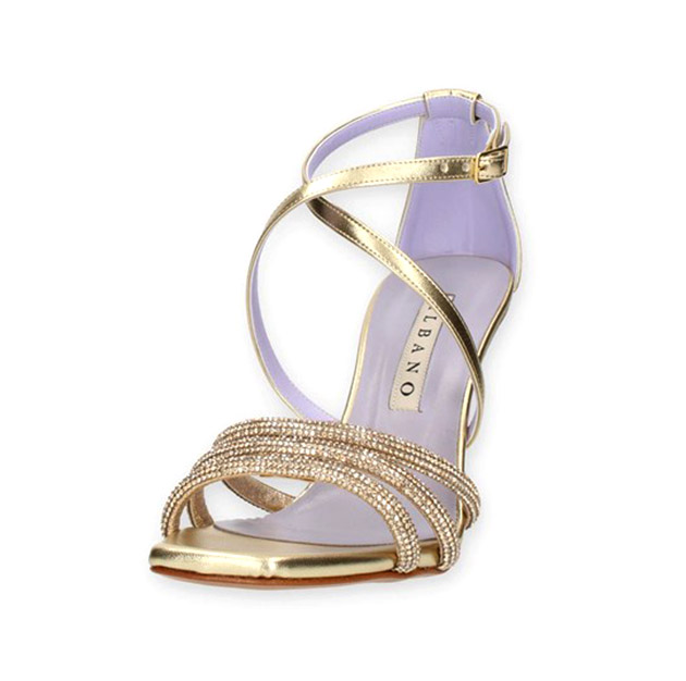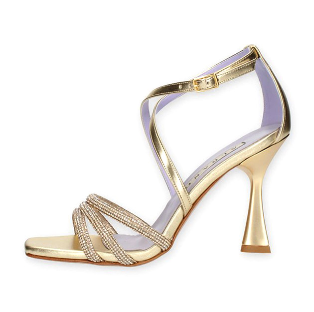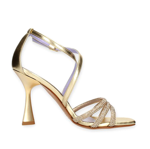 Sandalo Donna metallizzato platino in pelle laminata, caratterizzato da listini in strass. Elegante e glamour. Made in Italy.