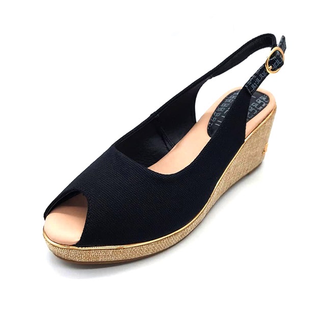 Sandalo Donna nero in tessuto, con zeppa a contrasto di colore, con glitter e particolari gold metal. Logo laterale. Stile glamour per questo sandalo adatto a tutti gli outfit.