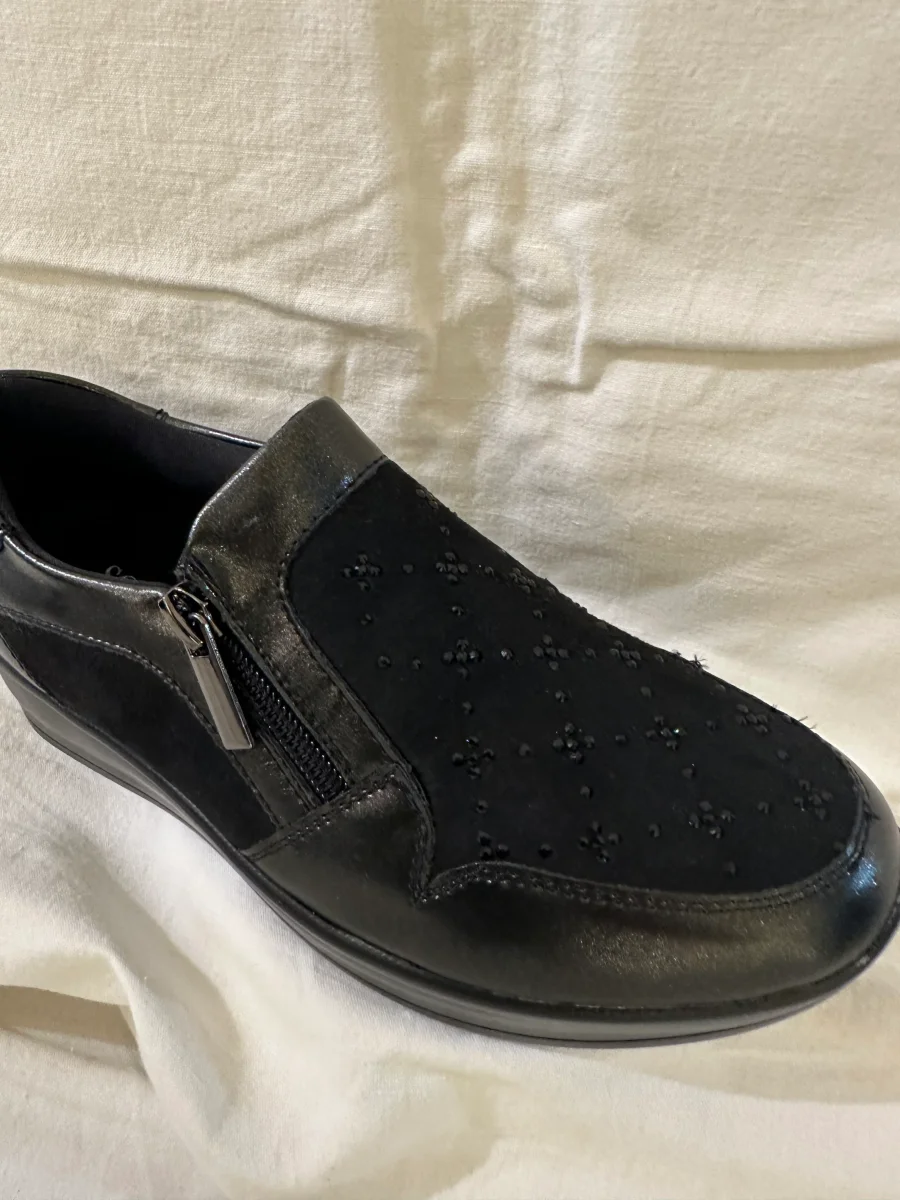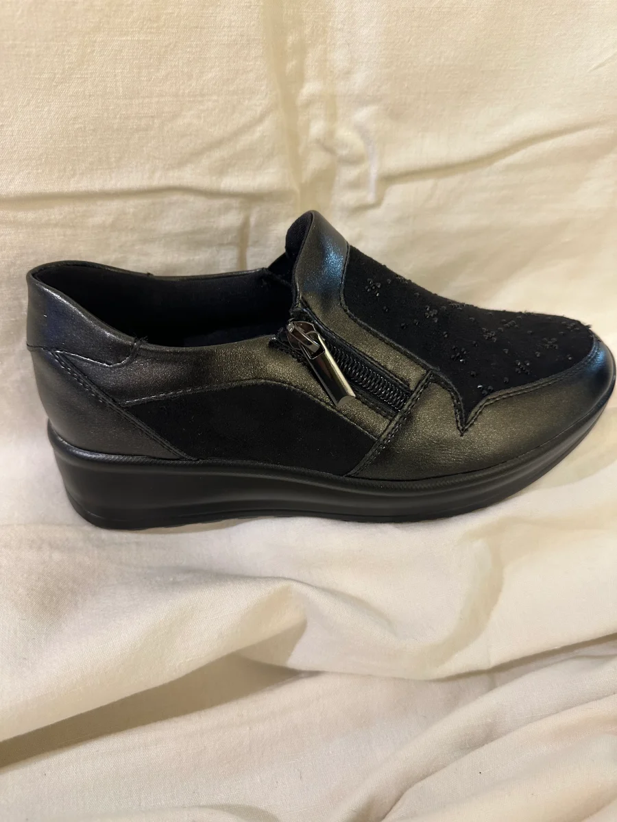 Se stai cercando una scarpa perfetta per camminare lunghi periodi, morbida e confortevole lโhai trovata! Zip esterna per renderla facile da indossare, molla sul collo del piede per modellarsi, dettagli in strass, contrasto tra scamosciato e ecopelle luminoso. Plantare morbido in memory e suola a zeppa.